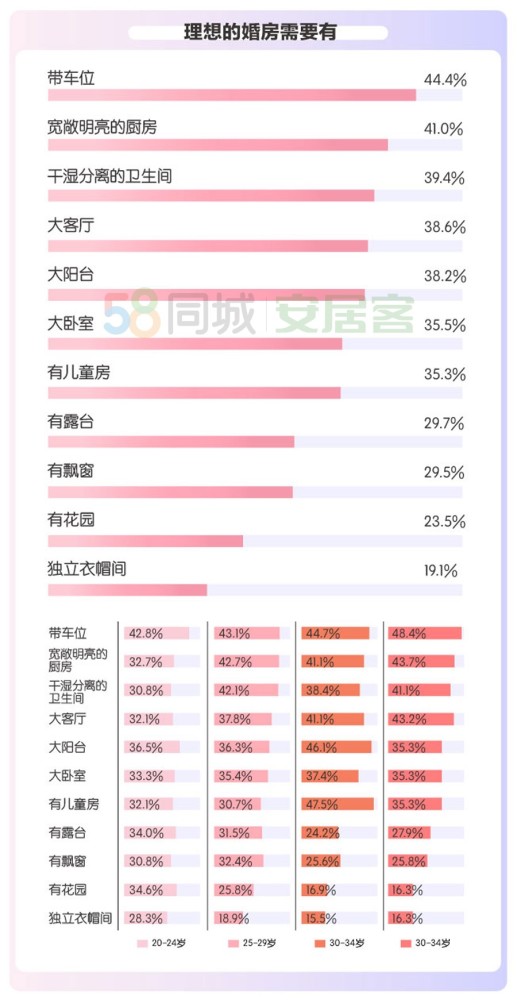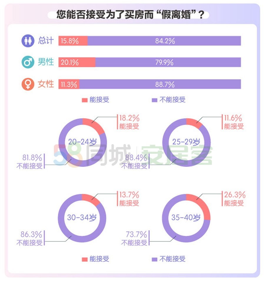 婚前是否要买房,能接受租房结婚吗?买婚房主要考量什么因素?8月24日,在七夕节前夕,58同城、安居客发布《2020年都市男女婚房置业报告》,解读都市男女如何看待结婚和买房的关系、对未来的家所抱有的期待。 44%的受访者接受租房结婚 对很多人而言,房子能带来安全感,房子代表着居有定所。报告显示,有80.9%的人表示婚前买好婚房是最佳选择。64.1%的婚房购房者表示结婚时优先买房,两成婚房购房者表示房子车子全都要。对于时下兴起的租房结婚,调研中有44%的人认为爱情不是租来的,租房结婚也并无不可。 购房是成家过程中的重大开销,掏空“六个钱包”的现象也不少见,而共同还贷已成为时下最多家庭的选择。调研中,有47.1%的人表示婚房是由男方出首付,双方共同还贷来解决。此外,选择婚房资金由双方共同负担的占比也有33.5%。 调查显示,男性愿意自己承担首付,双方共同还贷的占比超五成;作为新时代独立女性的表现也丝毫不亚于男性,愿意共同负担购房款的占比为37.3%。对于婚房的月供,有近六成的调研人群表示,月还款额在家庭整体收入的30%-40%左右,一线城市中还贷压力更大,月供占收入50%以上的占比为15.3%。 六成受访者买婚房时青睐三居室 买房无小事,特别是对于新婚夫妻来说,房子买在哪里需要考量的因素也更复杂。报告指出,新婚夫妻在选择婚房时,交通、环境地段、学区这三项是多数购房者优先考虑的因素,占比均超过40%。相比90后,80后的购房者对于学区房的关注度相对更高;90后则更看重物业及服务,此外,90后中超一成的人表示选择婚房时也很看重开发商的品牌,考虑房屋质量的人群占比也高于80后。 对于理想的婚房,多数参与调研的人群倾向于选择新房,占比近八成;另有13.6%的人表示婚房无所谓新旧,有家才更重要。户型方面,多数购房者希望一步到位,选择三居室的占比62.1%。 对于婚房的理想,实际上也充满了对未来高品质生活的追求。报告显示,选择要有车位的购房者占比最多,为44.4%,此外,宽敞明亮的厨房及干湿分离的卫生间也排在靠前的位置。从年龄上看,年轻的90后更注重自身居住的舒适性,20-24岁的购房者选择独立衣帽间的占比在28.3%,对于飘窗的需求也要高于80后;而80后对于大客厅、大阳台的需求明显高于90后,此外,80后更多为下一代考虑,选择“有儿童房”的30-34岁购房者占比47.5%。 有人说,婚姻是神圣的,不可当儿戏;也有人说,在房价面前,不得不低头。动辄数百万的差价,有些人选择用“假离婚”来换取首套房的购房资格。面对这个问题,报告显示,有84.2%参与调研的人选择了“不能接受”,其中女性不能接受“假离婚”的占比88.7%。从年龄上看,35-40岁的80后选择“能接受”的26.3%的占比相对较高。实际上,离婚没有真假一说,若是弄假成真,必将得不偿失。