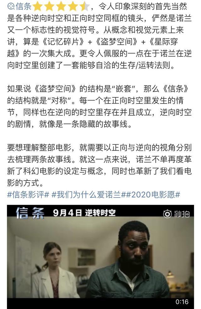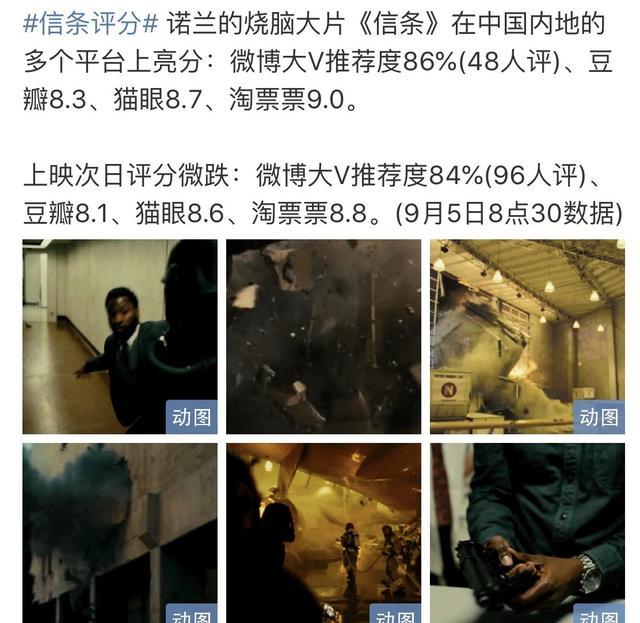 9月5日,是电影《信条》上映的第二天,这部诺兰烧脑电影《信条》口碑随之出炉,从国内一直知名平台评分的分数来看,全网没有低于8分的评分,从各大数据来看,《信条》还是一部值得去影院观看的电影。你们有没有做好去观影的准备呢? 《信条》零点场首映礼,就有很多观众参与观影,也是对诺兰新片最大的支持,观众观影后也是纷纷推荐观影,不过有意思的是,网友表示没怎么看懂,对于熟知科幻电影的朋友都知道,要想真的领悟剧集的内涵,还需要二刷,甚至三刷,四刷。 《盗梦空间》和《星际穿越》积累了大量的粉丝,所以《信条》首映当日的票房达到了5846万,排名第一,紧随其后的就是大家熟知的《八佰》,9月4日票房在5764万,仅次于刚上映《信条》,排名第二,其实《八佰》在9月4日还能有如此高的票房,也证明《八佰》的热度还是很高的。 与《信条》同日上映的还有一部影片叫《假面饭店》,而这部影片的票房仅有303万,相比信条和八佰真的少得可怜。这部新片选择和《信条》同期上映,难免会受到很大的影响。与《信条》错开档期上映也许票房会高一些的。 《信条》上映,难免有观众会拿它和前两几部影片进行对比,网友认为在人物角色的情感方面不如《盗梦空间》和《星际穿越》,整个故事都集中在了一个概念上。虽然在特效上面和荧屏上有很大的震撼后冲击,但是从情感冲击而言,尤其是结尾时,可能体会不是那样的强烈。 也有网友认为这部剧真的太烧脑,看过去之后完全没有懂啥意思,按照之前的剧集套路,都会有主线和辅线,而这部影片感觉还隐藏了一条故事线,让人一时半会不能去理解。感觉是一部多线程的影片。 其实该影片单从观影体验来说,是感觉挺好的一部影片,无论是导演拍摄手法,还是主演在影片中的表演,都非常出彩。《信条》口碑获得了好评,全网评分都高于8分,对于观众表示看不懂剧情,你们有什么想说的呢? 不得不说《信条》的剧情代入感还是很强的,这个大家都熟知一部好的影片好不好这个很重要,它能在很短时间抓住你的内心,让你跟着故事或者电影内认为的情绪或者剧情而走,看完后感觉很过瘾,不像有的影片你看着都能睡着。 《信条》就像一场魔术表演,你明明知道是假的,却还看不出来任何的破绽,整个剧情,画面,特效,等总能让你目不转睛,这也许是《信条》成功的一个原因吧! 就是这样一部全网评分都高于8分钟的电影,口碑是可以的,至于剧情不懂,那说明还需要用心揣摩。或者去二刷。 网友表示已经做好二刷的准备了,既然大家都愿意二刷了,说明这部影片真的很出彩,毕竟群众的眼睛是雪亮的,。 " X& c3 R9 w, h0 |9 m# D* P e