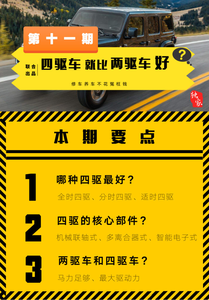 四驱车,是安全和性能的代言词,不同的四驱工作模式,怎么选择可以满足自己的使用,三把锁的四驱为什么可以在四驱里面称为老大!还有一种四驱,验车时却变成四驱,为什么?欢迎收看由腾讯汽车联合老单撩车出品《极限撩车》第十一期。 四驱里面又分三种,一种叫全时四驱,一种叫分时四驱,最近这些年新出的叫适时四驱。 一说起这个话题,我们遇到的第一个问题。就是有人问我:哪种四驱最好? 不差钱,可以买全时四驱还带“三把锁”的,最好!这种也最贵!它的典型代表就是奔驰的G。全时四驱带前、中、后差速锁。 最经济越野效果最好的是分时四驱。 各方面兼顾,有较好的通过性,价格适中是适时四驱。 什么叫全时四驱,就是什么时候都是四驱模式,基本上5/5分配。就是前轮提供50%的驱动力,后轮也提供50%的驱动力。 最大的好处是什么呢?是安全!它拐弯的时候有非常好的循迹性。循迹性是什么能呢?就是你想怎么拐就怎么拐,它能完全按照驾驶员的意图。 不好的是什么呢?凡是四驱的车都比两驱车费油。再有一个呢,四个轮胎也会相对磨损的比两驱车快,再一个其实四驱车的噪音比两驱车大。 分时四驱就是,它有四驱和两驱两种模式,在开启四驱模式时,把前驱和后驱用一根通轴锁死在一起,就变成了一个四驱。 那分时四驱最大的问题是什么呢?这个大家一定不要出现误操作!在铺装路面也就是干燥的柏油路面,分时四驱是不能挂上四驱的。你开个时速六七十、七八十公里,前面有个急弯,打一把方向中间那根抽就被掰坏了。所以你在验车的时候,四驱车变成了两驱,因为验车时不能开启四驱模式。 牧马人这些分时四驱车,在路上跑的时候,都是两驱的模式跑的,没有用四驱模式跑。 什么时候才可以开启四驱模式?遇到大雨、雪、沙地、泥泞、乱石地……允许轮胎打滑的时候才能用。 适时四驱是指汽车在一般情况下都是两轮驱动,当某一个车轮打滑、汽车无法前进的时候能够自动的转换为四轮驱动。 这种四驱系统会根据车辆的行驶路况自动切换为两驱或四驱模式,不需要人为操作。 第一代 机械联轴式。 这种四驱的核心部件是液力耦合器,在这个耦合器中充满了硅油,输入轴和输出轴一端与浸没在硅油中的叶轮相连,另一端则与前后差速器相连。在正常行驶的时候,前后车轮保持相同的速度运转,液力耦合器的两个轴之间不存在转速差。当前轮出现打滑的时候,转速会超过后轮,从而导致耦合器里的两个叶轮之间出现转速差,这种转速差会导致硅油升温而粘度迅速升高,从而将动力传递给后轮。 第二代 多离合器式。 这种适时四驱的核心部件是多片离合器式限滑差速器。多片离合器式差速器主要是通过湿式离合片产生差动扭矩,而离合器的压紧与分离是靠电子系统来控制的。车辆在正常行驶时,驱动形式为前驱,如当系统检测到车轮打滑时,通过电子系统控制离合器压紧,进而将部分动力传递至后轮,理论上电脑会根据车速与路况自动分配前后轴扭矩,以达到抓地性能最优化。不过这种四驱系统通常在主驱动轮失去抓地力(打滑)后,另外的驱动轮才会被动介入,所以它的响应速度较慢。 第三代 智能电子式。 这种适时四驱可以根据车轮打滑或转向信息,精确控制智能分动器向四轮传递出大小可控的扭矩,提高整车加速性、稳定性和燃油经济性。在停车时,传递给前轮扭力非常低或为零,提高了操作的便利和舒适性。在ABS工作时,短时间内迅速切断前轮动力传递,确保刹车时整车的稳定性。加速时,在四个轮上实现最大的牵引力,加速性更好。在湿滑路面上时,与其他安全系统通讯,实现最佳的牵引力和安全性能。理论上可以做到媲美甚至超越最好的全时四驱,但是目前技术上还没有达到。当然智能化是所有科技发展的未来。 假如你的发动机驱动力是比较小的车,四驱版本和两驱版本比起来,两驱版本可能快一些,四驱版本反而慢些。但是如果发动机的马力足够,一定是四驱的快。为什么?就是因为,你的发动机的最大驱动力根本不足以让两轮驱动的时候就出现打滑现象。四驱对驱动力来说没有任何帮助。 所以对于排量小的四驱车,它的加速性能并不会比同排量两驱车好。但是对于大功率的车来说四驱的加速性能,就明显比同排量两驱好。 - u. b: a5 e( D" ?& s/ d) Z
