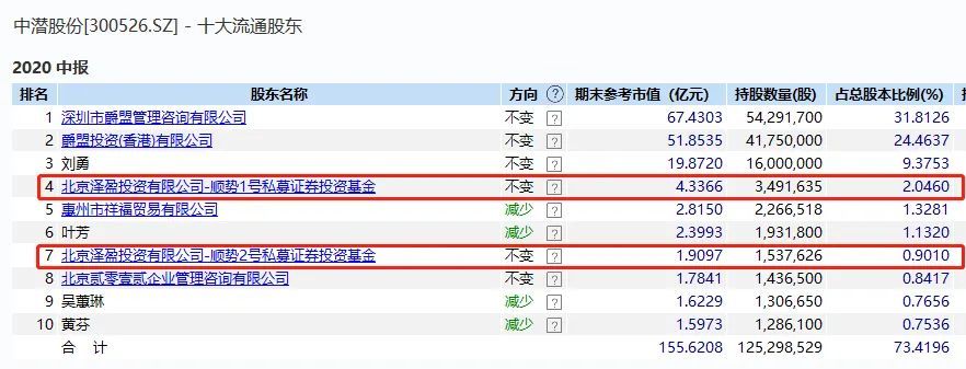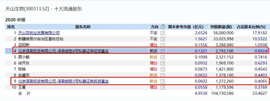 中国基金报 江右 北京泽盈投资,再次现身妖股股东当中! 近期,创业板低价股爆炒第一妖股,天山生物12个交易日11个涨停,暴涨495%,两度遭停牌,引发高度关注!翻开十大流通股东,北京泽盈投资公司旗下2只产品今年二季度刚好进驻,该公司今年上半年因中潜股份备受关注,去年5月开始一路举牌,股价异常彪悍,最高暴涨18倍。 就是这么一家私募机构,短短一年之间,身影出现在两只严重异常波动妖股中。 12天5倍妖股: 北京泽盈现身天山生物暴赚 8月24日,创业板注册制改革首批股票正式上市,创业板股票涨跌幅也全部调整为20%,天山生物成为改革后创业板低价股爆炒的最典型个股,在改革实施前后,8月19日到9月8日(中间有停牌),12个交易日当中11个涨停,股价暴力拉升495%。 9月9日,天山生物再度遭停牌。 翻开天山生物最新的中报,今年6月底的十大流通股东名单,虽然时间过去数月,但作为最新股东持仓数据,仍然值得研究。作为一家连年亏损的股票,天山生物流通股东名单中,鲜少有机构现身。 然而,今年二季度末,私募机构北京泽盈投资公司旗下两只产品,突然新进现身,泽盈顺势8号、泽盈顺势3号分别持股279.31万股、127.23万股。 这几年,天山生物连年亏损,2018年亏超19亿元,2019年亏超6000万元,2020年上半年又亏700多万元,2015年、2016年也是亏损,2017年靠着非经常性损益刚好扭亏。 私募押注或已暴赚过亿元: 天山生物遭起诉或被ST 虽然天山生物业绩如此不堪,但在二季度新进买入天山生物,北京泽盈投资却可能已经暴赚(浮盈)过亿元。 今年二季度,天山生物的均价为4.86元,北京泽盈投资持股约400万股的成本为2000万元左右,按照最新股价34.66元,如果目前仍然持股不变的话,浮盈超过1亿元。 股价异常波动,9月9日再度停牌核查的天山生物,又遭遇诉讼。 天山生物9月10日晚间公告,公司收到浙商银行宁波分行转来的《民事起诉状》、《受理案件通知书》。天山生物 2019年11月13日,浙商银行与天山生物签订《最高额保证合同》一份,约定天山生物自愿为大象广告依主合同与浙商银行形成的债务提供担保。担保的主债权为自2019年11月14日起至2020年11月14日止,在6496.6万元的最高余额内。 2020年5月29日,浙商银行向大象广告发放贷款393万元、5000万元各一笔,到期日均为2020年8月28日。贷款发放后,大象广告仅付息至2020年7月20日,此后未付,7月21日电脑自动扣本金0.01元。现贷款已逾期,借款人显已违约。 浙商银行请求判令大象广告立即偿还原告借款本金5393万元,支付至2020年8月28日止的利息35.58万元;并支付自2020年8月29日起至实际清偿日止、以借款本金5393万元以及利息35.58万元为基数,按年利率9.135%分别计算的逾期罚息及复利。同时判令天山生物在6496.6万元范围内对大象广告应履行的确定债务承担连带清偿责任,并承担本案诉讼费用。 天山生物表示,截止2020年6月30日,公司货币资金余额为1734.84万元,若该诉讼结果不利于公司,可能加剧公司现金流压力,存在资金链紧张的风险。同时,如果法院采取保全措施,公司存在资产或者银行账户被查封或者冻结的风险。 天山生物也表示,公司已在以前年度就浙商银行宁波分行该笔借款担保计提预计负债,截止本公告披露日预计负债余额为6,496.60万元,因此,若该诉讼结果不利于公司,也不会对公司本期或期后利润产生重大影响。 市场人士表示,天山生物目前状况堪忧,不排除明年可能被ST。 举牌股中潜股份最高暴涨18倍: 遭交易所反复问询 在天山生物之前,北京泽盈投资,还曾因举牌中潜股份,以及中潜股份的异常走势备受关注。 最新的持仓数据显示,北京泽盈投资不仅持股天山生物,今年二季度末仍然还在中潜股份的前十大流通股东当中,顺势1号、顺势2号为天山生物第四大、第七大流通股东。中潜股份也是一只妖股,北京泽盈投资还对该股进行了举牌。 2019年11月4日,中潜股份曾公告,2019年5月9日至2019年10月30日,北京泽盈通过旗下16只私募证券投资基金,以集中竞价方式合计增持974.48万股,占公司总股本的5.71%。北京泽盈买入均价29.88元/股,合计耗资约2.9亿元。北京泽盈投资的这一举牌出现违规,达到5.71%才披露,解释为“员工疏忽”。 从2019年5月开始举牌,中潜股份的走势就异常强势,今年3月份更是直线飙升。从去年5月9日北京泽盈投资开始建仓日收盘价9.66元,到今年4月最高182.78元,中潜股份股价一度暴涨17.9倍。 在今年4月股价冲顶之时,中潜股份也受到监管函,董秘也辞职了,股价也出现连续跌停。公司也因为收购、转型、关联交易等问题反复收到交易所关注函。 北京泽盈投资股东很神秘 不论是天山生物,还是中潜股份,从业绩方面都不是绩优股,但北京天泽投资却屡屡投资这类股票,并遇上暴涨的妖股行情。而北京泽盈投资公司,目前看也是家比较低调的公司,并未看到官网,背后也没有发现比较知名人物。 中基协和天眼查数据显示,该公司为两位自然人股东,任成忠持有91%的股权,李静蕊持有9%,李静蕊同时为公司法人,公司注册资本为1000万元,该公司目前有21只私募基金产品。 李静蕊2009年入职天津盛世弘兴汽车销售有限公司财务部,2015年任财务总监。2018年5月,李静蕊入职北京泽盈投资,同时成为了法定代表人。 任成忠、李静蕊并非北京泽盈的初始股东。北京泽盈成立之初,个人黄宝安持股80%,凌敏持股20%,黄宝安担任执行董事、总经理,凌敏任监事。2018年10月,北