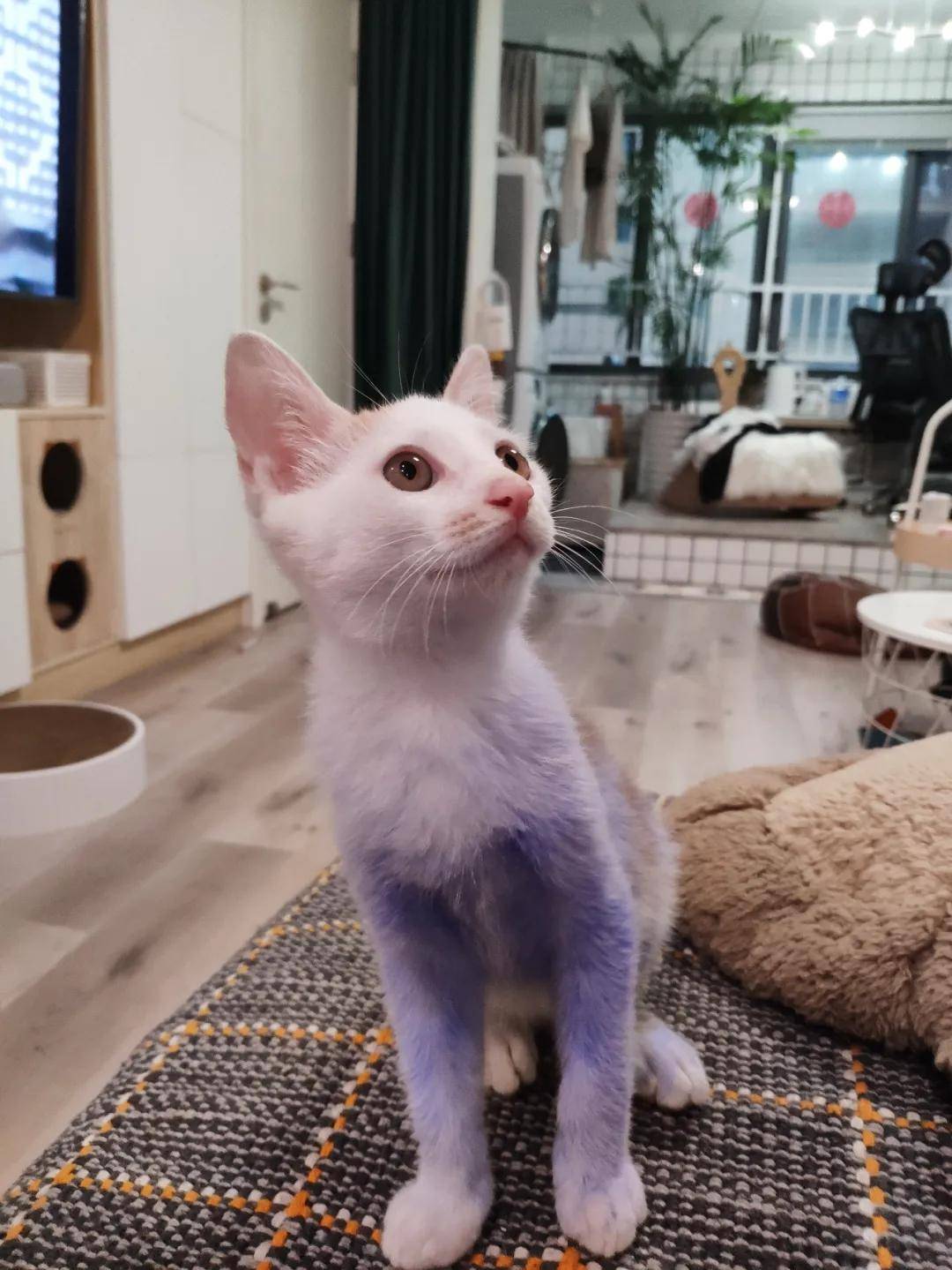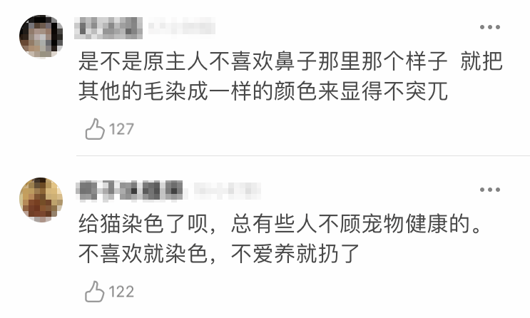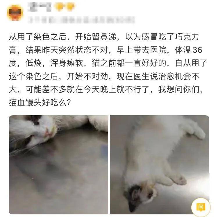 两个月前,网友@ネф̶ イω 在豆瓣猫小组发了一则求助帖称: “自己捡了一只猫,但这个颜色,是田园猫吗?” 当时,大多数人看完照片纷纷夸赞小猫咪的神仙配色; 还有人耐心回应,小猫应该是只田园长毛猫。 后来,网友把小猫送给朋友照顾了。 时隔一个月,网友收到朋友发来的一张猫咪的近照,顿时傻眼…… 因为小猫洗了几次澡后,毛色越洗越白,直接从咖啡色褪成了白色? 虽然网友自己也养了猫,但看到这么奇怪的现象,一时也无法理解。 为此,网友再次发帖求助:难道猫也会掉色吗? 不出所料,评论区大家的第一反应跟我一样,一致认为猫是被人染色了。 更令人心痛的是,给猫咪染色的现象并非个例。 ▼ 今年6月,@和猫住 曾救助过一只浑身紫色的流浪猫。 经过仔细检查后,大家发现小猫的紫色毛发是被人用染剂染色的,好在毛发下的皮肤暂无大碍。 几天后,一位有爱的小姐姐将它领养回家了。 在耐心的照料下,小猫身上紫色毛发也渐渐褪色了。 没过多久, 又有路人捡到一只蓝色的猫。 猫的颜色极其夸张,看看这个浓度,实在太吓人了。 路人第一时间送猫去了医院,医生判定这是蓝墨水染色所致,对身体的影响不大,会慢慢褪色的。 经过很长一段时间后,小猫也逐渐恢复本来的样子了。 by 微博@和猫住 话说回来,这种凭私心篡改猫毛色的行为,真的可以吗? 答案是:当然不可以!不可以!不可以! 为了满足自己的虚荣心,枉顾猫咪的健康,说到底不止自私和愚昧,而且百害无一利。 染色易导致猫咪焦虑 首先,从情绪上讲,染色容易使猫焦虑。 毛发和气味是猫自我认知的重要标志之一,染色会造成猫对自己身份的认知障碍。 猫被染色后,毛发上会沾有刺鼻的化学异味,会使猫变得没有安全感,继而出现食欲不振、情绪不佳等症状…… 有的猫胆子小,被染色过程中可能会引起应激反应。 而应激不仅会导致猫咪发病,极端情况下甚至有可能猝死… 染色=破坏猫咪皮肤的保护膜 你以为染色剂只是依附在猫毛罢了,当然不是啊! 猫皮肤厚度很小,仅有0.4~2mm,意味着这些化学成分更容易渗透到猫皮肤中。 皮肤和被毛是猫的一道坚固的屏障,它能防止体内水分的丢失,抵御某些机械性的损伤,保护机体免受有害理化作用的损伤。 染色剂里的化学成分,会杀死它们身上的益菌,影响皮肤油脂的分泌,甚至会引发皮肤过敏。 更严重的是,鼻子、眼睛、嘴巴等敏感器官也会被慢慢侵染,导致失明、嗅觉消失、休克等。 染色轻则中毒,重则致命! 众所周知,猫日常有舔毛习惯。 被染色后的毛发里残留化学成分、香精香料极易被舔食,久而久之,这些化学成分会在猫体内累积。 猫的肝脏代谢根本不能完全分解这些物质,会造成瘙痒、耳朵充血、水疱等一系列健康问题,甚至会直接中毒死亡。 试问:为了满足自己畸形审美的尝试真的值得吗? 每一只猫都是造物者创造的奇迹,它们本来的样子就很美了。 譬如,我国的中华田园猫:狸花、玳瑁、三花、彩狸、奶牛、玄黑、雪白、橘色…它们各有各的美。 我们从来不提倡给猫染色,并且坚决抵制! 任何对动物具有强制性的,违背了动物本身样貌或习性的行为,归根到底,都是一种伤害! 最后,希望大家帮忙扩散出去,让更多人知道给猫咪染色的危害,别再让任何一只猫被迫失去原本的样貌。 * E7 R9 E# B2 M/ u% ^