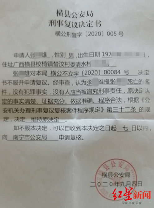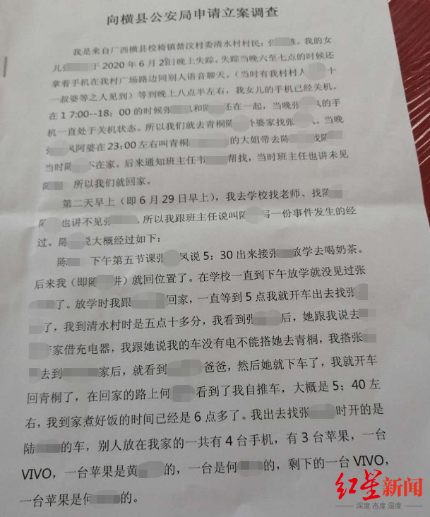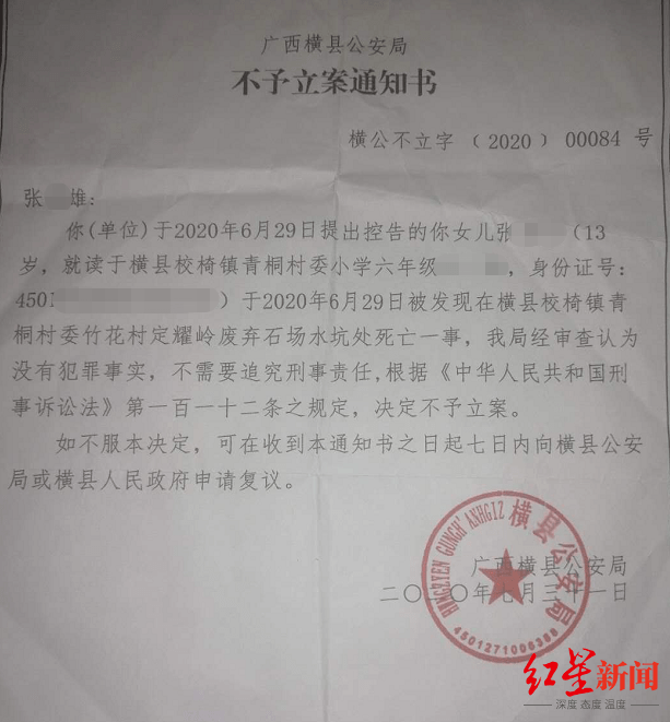 6月29日,广西横县13岁少女小凤失踪一夜后,其遗体在山后一处水塘里被发现。次日,她的手机在同学陈某(女)家里找到,但里面的内容疑遭删除。小凤父亲张某雄报警后,警方经调查认为,事件中没有犯罪事实,不予立案,“警方告诉我女儿是在水边拍照时掉入水中。” 张某雄对此表示怀疑,他称,女儿遗体被发现时,手机和身上的玉佩都不翼而飞。而他找人恢复数据后,发现女儿手机中有数段未成年人不雅视频,其中一段疑似女儿被人性侵。同时,女儿失踪当天陈某是最后见到她的人,在警方调查期间,陈某的陈述与此前不一致。 张某雄提出复议申请,警方经审查认为,该案没有犯罪事实,没有人应当追究刑事责任,根据相关规定维持不予立案决定。 横县警方刑事复议决定书 少女失踪一夜后陈尸水塘 手机中疑发现不雅视频 小凤家住南宁市横县校椅镇榃汶村委清水村,生前就读校椅镇青桐村委小学六年级,两地相距两三公里。张某雄告诉红星新闻记者,6月28日他下班后,回到家发现女儿不在,“奶奶说孩子在学校补完课到家后,与一名姓陈的同学出去玩了。”张某雄称,陈某与女儿年龄相仿,也经常在一起玩。 到晚上8点时,小凤还没有回家,其电话、微信也无法接通。张某雄隐隐有些担心,便出门打听女儿下落。有村民称当天下午五六点的时候,看到她和那名陈姓同学在一起玩,“晚上7时左右,还有人看到她拿着手机在村子里的广场路边与人语音聊天。” 死者小凤生前照片 张某雄称,他们四处寻找未果后,又去找那名陈姓同学,当晚对方不在家,“后来通知班主任帮找,班主任也说没有见到陈某。”次日一早,他在学校找到陈某,但对方称不知道小凤去向。 6月29日上午寻找未果后,张某雄拨打110报警,称自己女儿失踪。当天下午3点半左右,张某雄接到校椅镇派出所民警电话,称在竹花村定耀岭一山上废弃采石场的水坑里发现一具漂浮在水面上的尸体,叫他前去辨认。 张某雄称,为方便联系,他给女儿买有一部手机,但在事发现场没有找到那部手机,“随身佩戴的一块价值600多元的玉佩也不见了。” 6月30日,派出所民警告诉他说,在陈某那里找到了女儿的手机,“但里面的微信、QQ和电话通讯录全部被删除了。”张某雄称,后来横县公安局刑警队民警说“女儿手机内容恢复了,但没有什么线索值得查。” 7月13日,接校椅镇派出所通知,张某雄拿回了女儿的手机。他花钱请专业技术人员将女儿手机里面的数据进行恢复。而在恢复后,他称发现女儿手机相册里有数段未成年人不雅视频,其中一段疑似女儿被男生按在草地上性侵。 不过该段视频中女生未露脸,张某雄称,“听声音像是女儿的。” 警方:不构成刑事案 将发布通报 张某雄称,他发现,女儿手机显示曾有多个陌生电话登录过她的微信,如今那些电话全部停机。而更令他疑惑的,是陈某在配合警方调查时的陈述与此前不一致。 张某雄申请立案的材料中,提到了6月29日他去学校找到陈某后,陈某所述的事发经过 张某雄在向警方申请立案调查的材料中提到,6月29日早上,他在学校找到陈某后,陈某在陈述事件经过时称,6月28日放学后,她的确去找了小凤,但将小凤送到另一同学家借充电器后,自己就回了青桐村,“在路上遇到其他同学大概是5点40,到家煮好饭的时间已经是6点多了。” 但在7月31日,张某雄去横县公安局拿不予立案通知书时,警方又告诉他,陈某承认当天下午和小凤一起去定耀岭那边,在水塘边拍照时,小凤掉入水中。“派出所称该事件构不成刑事案件,陈某也构不成犯罪嫌疑。”张某雄说。 横县公安局不予立案通知书 警方出具的不予立案通知书显示,张某雄于今年6月29日提出控告的女儿小凤在当地一废弃石场水坑处死亡一案,该局经审查认为没有犯罪事实,不需要追究刑事责任,根据相关规定,决定不予立案。 张某雄觉得此事疑点重重,他向警方提出了刑事复议申请。9月4日,横县警方出具刑事复议决定书,经审查认为,该案没有犯罪事实,没有人应当追究刑事责任,根据相关规定维持原决定。 9月24日,横县公安局民警在接受媒体采访时称,当时警方将小凤手机数据恢复后并没有发现有不雅视频,“法医做出的结论是非暴力致死”,“如果张某雄提供相关视频给警方,经核查后属实会启动调查。” 25日,校椅镇派出所及横县公安局多位办案民警告诉红星新闻记者,公安局方面将就此事发布通报。