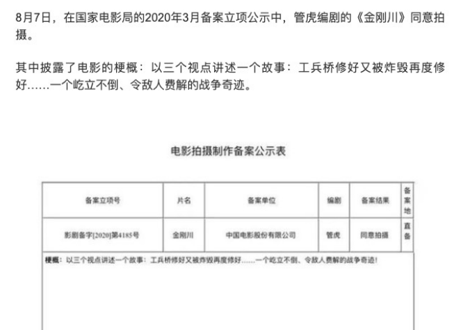 前几天《八佰》又上了热搜,只不过这次着实有些尴尬。 前面宣传爱国思想,这个没啥挑刺的,可紧跟着《八佰》发了一张图片,庆贺自己成为2020年全年全球票房总冠军,并附上自己二十多个亿的票房佳绩,这张图一出,引来无数嘲讽。 而这边嘲讽声还未过,导演管虎今年的第二部作品《金刚川》就确定10月25日上映,这个消息一出,网上又炸了。 8月3号网上曝光《金刚川》开拍,可如今马上定档10月25日,这就意味着从拍摄、剪辑、后期制作加起来也就不到三个月时间。 管虎,你真的知道你在干什么么? 其实如此短的拍摄周期不是先例,即使这样我们也曾产出过好片子的。 上个世纪的香港影坛,那时候真的是百家争鸣、红红火火。针对那个时期,你问每一个人都能说出自己心中最喜欢的电影,并且如数家珍。 《英雄本色》《笑傲江湖》《黄飞鸿》《赌神》... 李连杰、周润发、成龙、周星驰、刘德华...... 而那时的香港电影工业蓬勃发展,在钱的驱动下,快速成片是很多导演的必备功课。 王晶曾经在《圆桌派》上说过,当年他被要求拍摄一部电影,要在一个月后上映,而当时他手里有的只是周星驰、刘德华两个名字六个字,剧本、剧组啥都没有,这种情况在那个时代屡见不鲜。 《东成西就》只拍了二十七天,演员是现成的从《东邪西毒》拉过来的,可剧本是边拍边写。 《枪火》只拍了19天,投资仅仅250万港币,但拿下了金像奖六大提名,杜琪峰以此拿下最佳导演。 《92家有喜事》只拍了十三天,当年拿下近5000万票房。 《重庆森林》只拍了两个月,帮助梁朝伟拿下金马、金像两个影帝。 《倚天屠龙记之魔教教主》只拍了不到一周,《古惑仔第一部》只用了七天。 ...... 那时剧组拍摄周期短,有些戏甚至开拍了都没有剧本,演员也轧戏,其中周润发同时身上有七部戏要拍,可即便如此,那时的香港影坛仍不断产出高质量电影,这简直就是奇迹。 王晶曾经被问,为什么那时情况那么乱,没有剧本、演员轧戏、强迫日起上映导致拍摄周期短,可还好片子那么多?王晶回答的在很多人看来有些玄乎,可总结起来就是无论是演员、导演、剧组成员都百分之百投入。 只能这么说。 如今我们也是这样,临时确定、临时拍摄、演员没档期,可拍摄出来的成品呢?唉,不提也罢。 回到主题《金刚川》。 《金刚川》的内容为抗美援朝下的小人物,像这种战争片尤其是抗美援朝,难点也仅仅只有血腥场面这一项,总比《八佰》当时轻松很多,然而虽然题材不敏感了,可《金刚川》却远没有《八佰》时间充裕。 10月25日是我们抗美援朝胜利70周年,这个日期上映这部电影是早就定下的,原本定下的是开年就拍摄,哪成想遇上疫情,导致拍摄时间一拖再拖。 3月份才拿到拍摄许可,8月份才被爆出刚刚开拍,紧接着10月25日就要上映,这就意味着不到三个月时间里,拍摄、剪辑、后期制作等等工作都要完成,太赶了。 我们上述的那些香港拍摄周期很短的电影虽然确实存在,但其中很多都是小体量故事,所以只要剧本构思巧妙,演员演技到位,几乎就不会太差,而且像《重庆森林》王家卫的风格是偏写意,这都大大降低了难度。 《金刚川》的剧本是写工兵与桥,那首先场景搭建就要提前动工,而且在这个大时代背景下小人物如何自处,想来也绝对不是小体量,并且后期特效估计体量也不小,这些都是必须要解决的问题。 我当然相信管虎的功力,可对于如今的电影,早就没有了当年香港影坛那股子劲,也没有那时的竞争力。 那时的电影人为何能量如此之巨大?就是因为蛋糕小,可吃的人很多,要的就是人无我有、人有我新、人新我先,大家都是疯狗一样抢食吃,抢到了就是抢到了,抢不到就只能被恶死,在极限环境下,求生欲的爆发可以激发出一切潜能。 可如今呢?太安逸了,太轻松了,搞一个流量过来,随便一拍,就能保证赚钱,谁还会去抢食吃?在安逸的环境下待久了人是会退步的。 现在就只希望《金刚川》在剧本上能巧妙一些,毕竟现在也就只有剧本这一个优势,场面、特效我就不敢期待了,反正只要情节、演技到位,我都行,但如果这两点不达标,那可真就是完了。 2 q1 o% F P0 a0 `7 N3 F