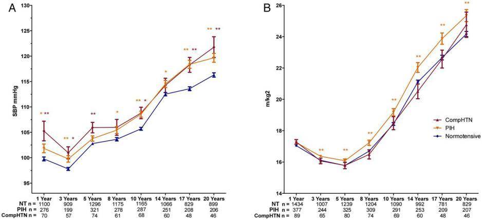 高血压是一种全球性慢性非传染性疾病,每年约有1040万人死于高血压[1]。 2020年10月8日是第23个全国高血压日,今年的宣传主题依旧是“18岁以上知晓血压”,以促进18岁及以上成人定期自我监测血压为重点,开展高血压防治健康教育和科普宣传,控制高血压危险因素,指导群众做好自我血压管理,切实提高高血压知晓率、治疗率和控制率。 高血压(图虫创意)虽然我国高血压的管理已有大幅度的改善,但随着步入老龄化的加速,我国高血压防治的形势仍十分严峻。令人担忧的是,高血压早已不再是“老年人病”的代表,近年来的研究显示,高血压在青少年群体中越来越流行,甚至成为了常见疾病。有学者发布研究,认为青少年患高血压等心血管代谢疾病,与母亲孕期患妊娠高血压息息相关! 什么是妊娠高血压? 近年来,女性超重/肥胖发生率不断上升,随之而来的超重/肥胖孕妇也越来越多。研究显示,孕前肥胖、孕期增重过多、能量摄入增加已成为妊娠高血压的主要危险因素[2]。 妊娠高血压疾病是常见的妊娠特有病,是妊娠与血压升高并存的一组疾病,可导致母亲及胎儿出现不同程度的损伤,甚至危及到母亲及胎儿的生命安全。妊娠高血压疾病一般在妊娠20周后发病,以高血压、蛋白尿及其他全身功能紊乱为特征。我国孕妇妊娠高血压的发病率为9.4%, 国外报道7%~12%[3]。该疾病严重影响母婴健康, 是孕产妇和围产儿病死率升高的主要原因。 不同类型妊娠期高血压疾病的母体心脏形态学变化(A:轻度先兆子痫组;B:重度先兆子痫态组;C:慢性高血压组;D:妊娠期高血妊娠期高血压疾病包括妊娠期高血压、子痫前期、子痫以及慢性高血压并发子痫前期以及慢性高血压合并妊娠。 妊娠期高血压疾病分类[5] 1、妊娠期高血压 妊娠期出现高血压,血压表现为收缩压≥140 mm Hg和 (或) 舒张压≥90 mm Hg,于产后12周内恢复正常;产后方可确诊。少数患者可伴有上腹部不适或血小板减少。 2、子痫前期 轻度子痫前期通常在妊娠20周后出现,血压表现为收缩压≥140 mm Hg和 (或) 舒张压≥90 mm Hg,伴有蛋白尿≥0.3 g/24 h,或随机尿蛋白 (+) 。重度子痫前期表现为血压和尿蛋白持续升高,常发生母体脏器功能不全或胎儿并发症。 3、子痫 子痫前期基础上发生不能用其他原因解释的抽搐。子痫发生前可有不断加重的重度子痫前期,但也可发生于血压升高不显著、无蛋白尿病例。通常产前子痫较多,发生于产后48 h者约25%。子痫抽搐进,前期症状短暂、面部充血,口吐白沫、深昏迷;随之深部肌肉僵硬,很快发展为典型的全身高张阵挛惊厥、有节律的肌肉收缩和紧张,持续约1~1.5 min,期间患者无呼吸动作;此后抽搐停止,呼吸恢复但患者仍昏迷,最后意识恢复,但易激惹、烦躁。 4、慢性高血压并发子痫前期 慢性高血压孕妇妊娠前无蛋白尿,妊娠后出现尿蛋白≥0.3 g/24 h,或妊娠前有蛋白尿,妊娠后尿蛋白定量明显增加;或出现血压进一步升高等。 5、妊娠合并慢性高血压 妊娠20周前发现收缩压≥140 mm Hg和 (或) 舒张压≥90 mm Hg,妊娠期无明显加重;或妊娠20周后首次诊断高血压并持续到产后12周以后。 妊娠高血压对子代血压水平的影响 自20世纪90年代 “成人疾病的胎儿起源学说”提出后,越来越多的研究证明生命早期的不良宫内环境不仅会影响胎儿的生长发育,也可能产生持续的结构功能改变,导致将来一系列成年期疾病的发生。同样,妊娠高血压若处理不当,也将对子代产生深远的影响。 已有研究表面,孕期患妊娠高血压可增加子代患高血压和心血管病(CVD)的风险。研究发现,孕8周时孕妇的血压与其子代儿童期和成年期的血压水平呈正相关,有美国学者对2012年至2013年,在美国出生的 979例平均年龄为7岁的儿童进行随访发现,妊娠期高血压和子痫前期孕妇子代的收缩压显著高于正常孕妇的子代[6]。 妊娠高血压孕妇与正常血压孕妇的子代血压水平关联[6]而澳大利亚的一项大型前瞻性研究更是将妊娠期高血压对子代的深远影响进一步“实锤”。该研究对1989年至1991年出生的2 862例儿童生后20年进行随访发现,与正常妊娠孕妇的子代相比,妊娠期高血压患者的子代在20岁时收缩压和舒张压分别平均升高3.7和1.4 mmHg;患有高血压的20岁左右的青年中,约有30%的患者母亲在妊娠期出现高血压;子痫前期或高血压导致早产儿,到20岁时患高血压的风险比正常人群增加了三倍(95% CI 1.3- 7.0, p=0.01)[7]。 妊娠高血压孕妇与正常孕妇的子代,1-20岁血压水平的比较[7]简而言之,妊娠期高血压不仅是对母体的一种潜在的持续性风险,更是会影响孩子的一生。除了血压水平,母亲患有妊娠高血压,是子代成年后发生CVD、代谢异常、神经发育异常及子痫前期等的高危因素。 妊娠高血压如何预防[8]? 无论是何种疾病,预防的效果总是大于治疗疗效,孕妈们能做的最好的事情,就是务必做到坚持防患于未然。因此,做好以下预防措施,才是上上策: 1、规律产检最重要!规律进行产检,做到早期发现、早期诊断、早期治疗,避免出现严重的妊娠期高血压疾病并发症。 2、健康饮食。专家建议:孕妈们应该合理膳食。食物多样,谷类为主;多吃蔬菜、水果和薯类;常吃奶类、豆类或其制品;常吃适量鱼、禽、蛋、瘦肉,少吃肥肉和荤油;严密监测体重变化,合理控制体重增长。 3、合理锻炼。怀孕的妈妈们应该进行科学的有氧运动、力量训练以及柔韧性训练,建议每周不少于3