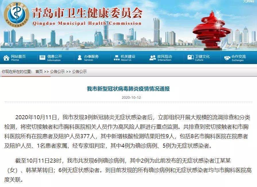 ▲视频截图。 青岛拉响了疫情警报。 10月12日,青岛市卫健委通报该市新型冠状病毒肺炎疫情情况。截至10月11日23时,青岛市共发现6例确诊病例,其中2例为此前发布的无症状感染者江某某(女)、韩某某转归;6例无症状感染者。到目前发现的所有确诊病例和无症状感染者均与市胸科医院高度关联。 在10月11日发现本土3名本土无症状感染者后,青岛方面就立即组织开展大规模的流调排查和分类检测,当天晚上不少社区就通知小区居民进行免费核酸检测,部分市民夜间排队等待做检测。同时,当地还将密切接触者和市胸科医院相关人员作为高风险人群进行重点监测;制定、启动全员检测方案,预计5天内对全市检测全覆盖。 应该说,在确诊病例出现后,青岛的一系列举措很果断。这一方面是因为对疫情防控的重视,常态化防控机制的完善,另一方面也得益于前期疫情防控所积累的经验,以及核酸检测等技术条件的成熟。 相较于此前一些局部地区针对新疫情风险的防控,可以预见,此次青岛病例的溯源和流调要付出更多的精力。像刚刚结束的“双节”假期,人口流动出现高峰,有数据统计,国庆、中秋8天长假期间,青岛市共接待游客总人数447.58万人次,因此对于前往青岛的外地游客,各地或也需要开展相应的核酸检测工作。 如济南就连夜部署,要求对近期青岛入济返济人员全面排查并进行核酸检测。而这也需要相关群体的配合,做到主动报告。 此次确诊病例的具体感染链条仍在调查之中,但目前发现的所有确诊病例和无症状感染者均与青岛市胸科医院高度关联,这无疑为疫情的溯源和针对性防控提供了一条非常重要的线索。而这一特征,也再次对医院等重点场所如何避免发生聚集性病例和交叉感染,发出现实警示。 ▲官网截图。 当前,由于全球疫情防控形势仍处于不明朗状态,“内防扩散,外防输入”仍不可有丝毫麻痹大意。如就在昨日,全国31个省区市又新增21例境外输入病例。而对于境外输入性疫情风险的防控,各定点防控医院是最重要的场所之一。 今年5月,国家卫健委下发《关于落实常态化疫情防控要求进一步加强医疗机构感染防控工作的通知》明确提到,由于新冠病毒传染性强,医疗机构面临的院内感染风险较高,稍有不慎易出现聚集性疫情;各医疗机构要充分认识院内感染防控面临的严峻形势,杜绝麻痹和松懈思想。 值得重申的是,在疫情防控常态化的背景下,随着各行各业复工复产的推进以及人口流动的正常化,局部地区出现零星病例,其实未尝不在可预期的范围之内。对此张文宏医生就指出,对于青岛这种局部疫情,可以通过扩大检测来获得“动态清零”。因此,对新出现的确诊病例要有百分百的防控应对,但也不必过于恐慌。只要继续遵循科学、精准的防控之道,充分利用好检测资源,相信就能以最小的代价将疫情扩散风险降到最低。 在相当长一段时间内未出现本土病例的情况下,局部地区疫情回潮,也应给整个社会的防疫神经带来触动——千万不能低估疫情反弹的可能性,该有的防疫之弦还必须绷紧。尤其是对于秋冬季疫情防控,来不得半点大意疏忽。