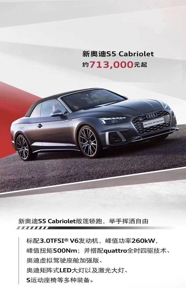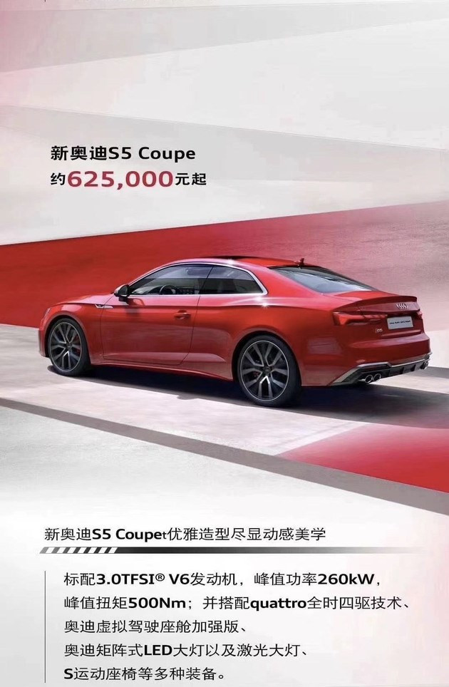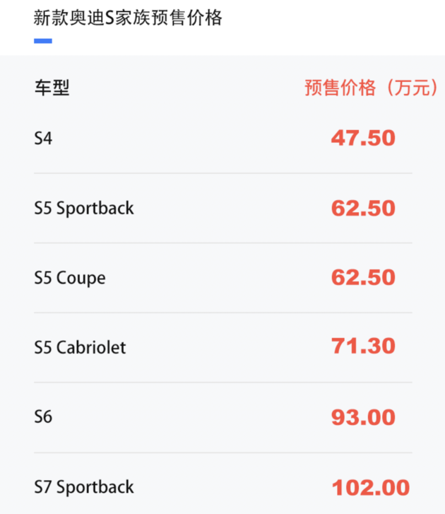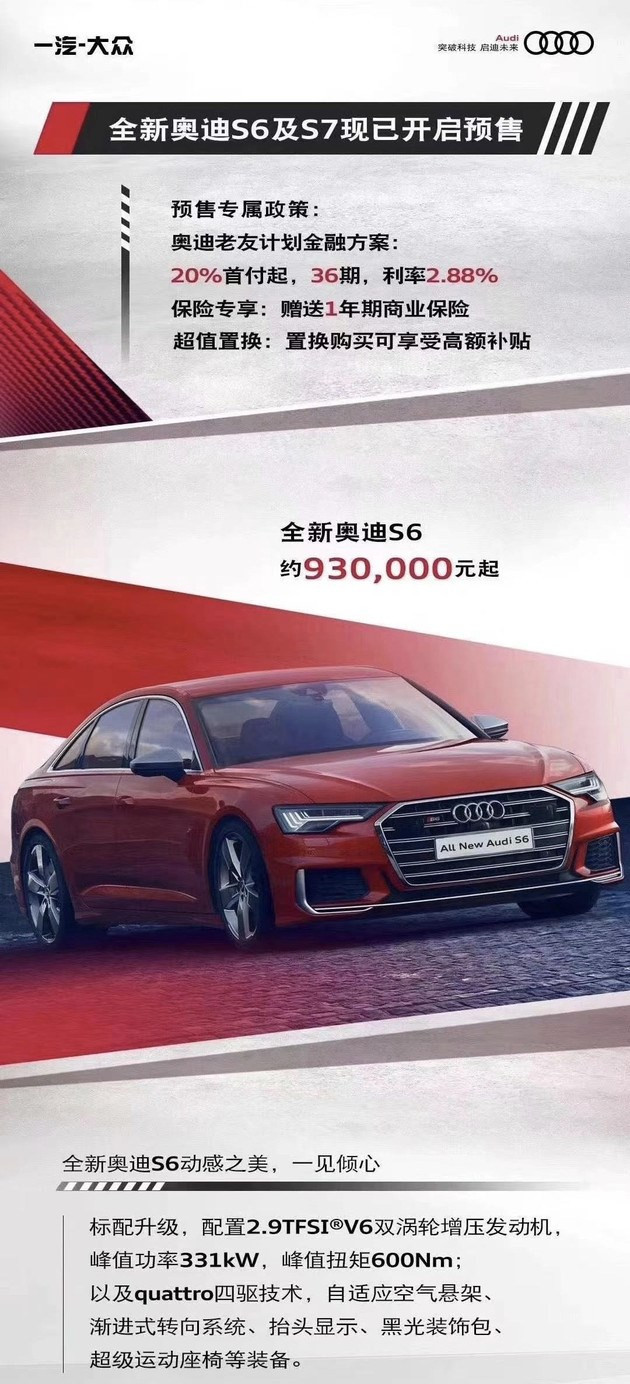 日前,我们从相关渠道获悉,新款奥迪S4、新款奥迪S5 Sportback、新款奥迪S5 Coupe、新款奥迪S5 Cabriolet、全新奥迪S6、全新奥迪S7 Sportback即将于本月20日正式上市。目前新车已经开启预售,预售价格从47.50万元至102万元。官方同时推出预售专属政策:包括奥迪老友计划金融方案、保险专享、超值置换多项购车优惠政策。