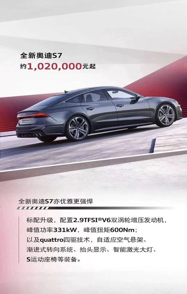 新款奥迪S7 Sportback基于大众集团MLB Evo平台打造,使用与S6相同的2.9TFSI V6双涡轮增压发动机,搭配48V轻混系统,最大功率为450马力,最大扭矩600牛米,匹配8挡手自一体变速箱,搭配quattro全时四驱系统,以及自适应空气悬挂。 % h, L, H/ X) _. O) }8 G1 Y7 h