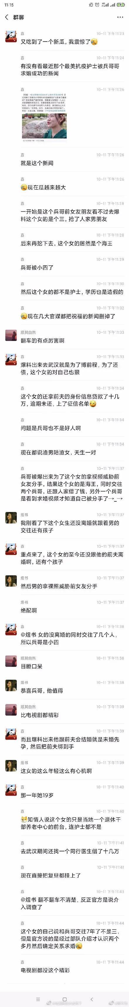 1 于鑫慧的A面人生 这两天,各路神仙都在和我聊“于鑫慧”这个女人。 每次聊完,我都觉得人性是一个很复杂的东西,有A面,有B面,然后交织出了C面,甚至D面…… 今天的文章女主角“于鑫慧”,到底是谁? 这要从今年武汉疫情爆发开始说起。 当时,武汉疫情爆发,全国人民陷入恐慌之中,一个叫于鑫慧的24岁姑娘,表现得非常有勇气。 在武汉疫情最吃紧时,她选择了报名去前线当医护人员。 因为家在江苏南通,当时武汉已经封城,所以于鑫慧去武汉这一路并不顺利。 原本7小时的车程,她花了22小时才到达,可见她想要参与抗疫的决心。 到了武汉,于鑫慧的日常工作,就是负责患者14天隔离期的护理工作: 比如每日6次查房,比如给病患量体温,比如登记病人每日状况等等。 还有一个细节很值得一提。 就是病患们出院当天,于鑫慧都会手写一张奖状,给他们鼓励,以及信心。 而这些奖状,是于鑫慧早在出发武汉前,就早早准备好了的。 直到4月14日,于鑫慧已经圆满完成了自己的抗疫工作,回到了老家南通。 接下来,这一段充满勇气与奉献的抗疫之旅,开始让她收获了满满好评。 她被称为“最美逆行者”,各大媒体对她的报道铺天盖地,赞美之声不绝如缕。 她也在3月24日,被江苏省委组织部,纳入党员(她是2月底递交的入党申请书)。 要知道,这是南通市唯一被省委组织部批准火线入党的志愿者。 随后,还有2020年南通五四青年奖章、2020年江苏最美人物江苏最美青年抗疫先锋、江苏“四个100”先进典型。 据说分量最重的一个荣誉,是2020年8月被评为2019年度学雷锋志愿服务疫情防控最美志愿者,受到中宣部等单位的联合表彰。 并且还有很多个人演讲,讲座,宣传等等等。。。后期表彰表扬太多,我就不一一列举了。 顺着媒体的强劲势头,于鑫慧也拍了一段视频。 高调表示自己崇拜军人,想要嫁给兵哥哥,在线全网征婚。 然后10月8日,她就真的如愿嫁给了一名向她求婚的兵哥哥。 当时全网重磅媒体,都在发文祝福她: 就连人民日报也表示恭喜: 但随后,我发现人日不知何时又悄悄删除了。 就此,掀开了于鑫慧的B面人生。 2 于鑫慧的B面人生 不吃瓜不知道,一吃瓜吓一跳。 网友们真厉害,竟能扒出于鑫慧背后那不为人知的故事。 瓜一:她没有护士资格,只是做过某服务中心的前台?于是中专学历假报本科伪造护士身份? 知名博主@有一点理想的记者,表示以她的实际技能,她在武汉只能充当最普通的志愿者。当时是全国支援武汉,比于鑫慧事迹更突出,工作更积极更重要的人,恐怕找出来几万个没问题。 图源网友爆料 瓜二:女主其实早已结婚,属于婚内征婚? 婚内征婚这个,已经在抖音上成了公开的秘密。 在她成名之后,她开始在网上高调征婚,还说要嫁给兵哥哥,实际上她那时候还处在已婚状态,育有一子。 图源抖音网友爆料 瓜三:男方前女友朋友看不过去,网上爆料称,女方是小三,抢了她朋友的男朋友,而男友也很渣,用裸照威胁前女友分手。 图源网友爆料 然后,前任那边,还爆出了与男方的聊天记录,看完简直令人咂舌。 图源网友爆料 以上为网传聊天记录,未知真假,但当事人目前还没有对此作出实锤澄清,所以看官可自行判断。 如果说瓜三可能不太真实,那么瓜四就真的是实锤了。 瓜四:女主四处借贷不还被执行,她的前夫起诉离婚内容惊人。 网友扒出女的竟然到处借贷,但都没有还,在中国裁判文书官网就能看到,于鑫慧已经被起诉列入失信被执行名单。 这个文书是2020年1月的时候,那个时候于鑫慧是处于失业,且处于“失信状态”。 并且,女的前夫起诉离婚,明确指控她“婚内与多人暧昧”、“不管孩子”、“对家人施暴”、“早已失业频繁出入夜店”等,更是在他不知情下,欠了几十万债务…… 有理有据,竟一时难以反驳。 今天我还看到了陆续爆出的其他一些小瓜,我就不放出来了,感兴趣的可以自行搜索。 就于鑫慧的B面人生,我看完竟是一时脑袋空白,语塞不通。 或许那句话说的没错: 在你看到的童话世界的缤纷色彩下,其实包装的是一盆来自现实世界的狗血。 3 写在最后 于鑫慧的这件事,我在网上能看到的负面信息很少,或者准确地说,是越来越少。(尤其知乎,都删帖删得妈的都不认得了) 于鑫慧的抗疫功绩与精神,我认为是值得赞许的。 但如果以上爆料属实,那么事件为何会演变到如今这个地步,我认为两大原因: 一,女的深谙人性,与其说她骗了所有人,倒不如说她利用了媒体宣传制度的漏洞,绑架了所有媒体。 二,官媒对这种好人好事过度宣扬,以为一本万利,其实是懒政表现。因为宣传部门大肆宣传正能量,造英雄的行为——殊不知,人无完人,过度追捧就是变相打脸。 也正因如此,这件事如今成为了一个敏感话题。 不知道媒体除了删文之外,还会不会彻查,给公众一个解释? 但如果不能重新给这个“抗疫女护士”定位的话,我觉得太对不起那些真正在一线上拼命的人了。 他们默默无闻,低调前行,结果最后却不如一个投机倒把的利己主义者。 这不仅仅是不公平,更是对公信力的一次重创。 转自搜狐网 南通0 |