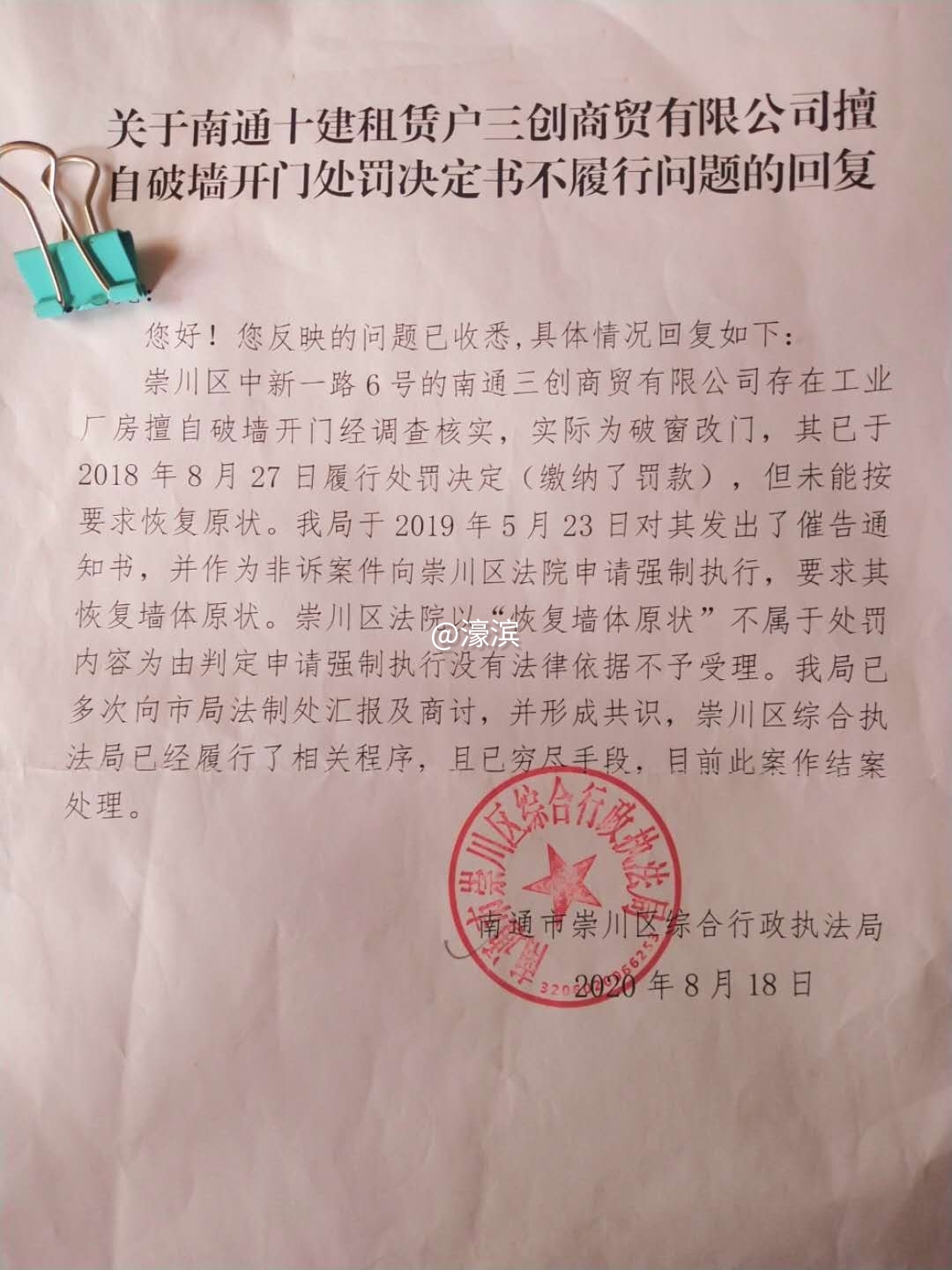 2018年1月举报人向南通市城管局12319举报南通三创商贸有限公司擅自将南通十建集团有限公司新建工业厂房破墙开门,南通市崇川区城管局向南通市规划局发函认定,南通市规划局2018年4月回函,建议城管部门按照《江苏省城市市容和环境卫生管理条例》及《江苏省城市容貌标准》对南通市中新一路6号破墙开门开窗案件依法查处。 随后南通市崇川区城管局发函给南通市城市管理行政执法局,2018年6月南通市城市管理行政执法局回函,根据《江苏省城市市容和环境卫生管理条例》第十条、《江苏省城市容貌标准》3.2.5、3.2.6及《江苏省城市市容和环境卫生管理条例》第四十九条进行查处。 根据南通市城市管理行政执法局 通执法函【2018】2号 关于对南通市中新一路6号破墙开门开窗案件依法查处的函 2018年7月南通市崇川区城管局向违法企业南通三创商贸有限公司送达责令改正通知书,南通三创商贸有限公司违反了《江苏省城市市容和环境卫生管理条例》第十条及《江苏省城市容貌标准》3.2.5、3.2.6,责令自收到本通知书之日起十日内自行履行环卫责任(将墙体恢复原状)。南通三创商贸有限公司拒不执行,2018年8月南通市崇川区城市管理行政执法局向违法企业南通三创商贸有限公司送达行政处罚决定书,依据《江苏省城市市容和环境卫生管理条例》第四十九条罚款800元,责令十日之内自行改正。 南通三创商贸有限公司对法律文书未复议、未诉讼,责令改正通知书及行政处罚决定书生效后,南通三创商贸有限公司除缴纳800元罚款后仍拒不将墙体恢复原状。 2019年10月,南通市崇川区城管局原局长龚培湘在南通市政风行风热线节目答复,南通市中新一路6号另两处荣威4S店及南通十建集团有限公司沿街违法擅自破墙开门已责令南通十建集团有限公司用红砖砌了矮墙,已经失去营业用房功能,南通崇川区城管局已多次约谈南通十建法人代表司光吾,要求其终止南通三创商贸有限公司合同,将工业厂房墙体恢复原状。并现场答复主持人有很多措施、手段让其执行到位。 上述法律文书生效后,举报人一行多次联系南通市崇川区城管局,要求执行生效法律文书,南通市崇川区城管局龚培湘局长、毛丽华大队长、法治科长马永东等以各种理由进行推脱,拒不履行生效法律文书,公然包庇违法行为。 根据南通市崇川区城管局行政权利清单0300015000 对不符合城市容貌标准、环境卫生标准的建筑物或者设施的强制执行按照《城市市容和环境卫生管理条例》(国务院令第101号)第九条 城市中的建筑物和设施,应当符合国家规定的城市容貌标准。对外开放城市、风景旅游城市和有条件的其他城市,可以结合本地具体情况,制定严于国家规定的城市容貌标准;建制镇可以参照国家规定的城市容貌标准执行。第三十七条 凡不符合城市容貌标准、环境卫生标准的建筑物或者设施,由城市人民政府市容环境卫生行政主管部门会同城市规划行政主管部门,责令有关单位和个人限期改造或者拆除;逾期未改造或者未拆除的,经县级以上人民政府批准,由城市人民政府市容环境卫生行政主管部门或者城市规划行政主管部门组织强制拆除,并可处以罚款。可见南通市崇川区城管局强制执行应报政府批准而非作为非诉案件向崇川区法院申请强制执行,南通市崇川区城管局故意混淆视听,拖延执法,拒不执法,故意包庇违法行为,包庇违法企业南通三创商贸有限公司及南通十建集团有限公司。 南通市中新一路6号沿街破墙开门共3家,崇川区城管局已要求南通十建将荣威4S店及南通十建店面下方砌了矮墙,失去店面功能,龚培湘局长在行风热线表态有很多手段可以执行,崇川区城管局答复书讲已穷尽手段,是停电、停水、还是封门了?等等。纯属胡扯,案件有执行依据不用,选择性执法,作结案处理属错上加错,明显包庇违法行为。上级部门不应也不能与其不法行为达成共识。 崇川区城管局应严格按照《城市市容和环境卫生管理条例》(国务院令第101号)对违规破墙开门案件强制执行。让违法者逍遥法外,法律尊严何在?政府公信力何在?崇川区城管局无视国家法律,公然包庇南通三创商贸有限公司及南通十建集团有限公司,造成极坏社会影响,属于严重行政不作为、瞎作为,应追究相关负责人法律责任。 既然南通市崇川区城管局把球踢给南通市城管局法制处,崇川城管毛丽华大队长要求举报人找市局法制处,请市局法制处指导执法(有录音为证)。请南通市城管局法制处胡炎处长代表市城管局指导崇川区城管局严格执行生效法律文书,维护公平正义。