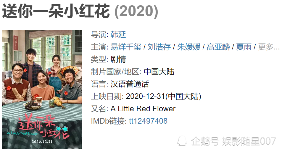 一提到剧情片这一耐人寻味的影视题材,相信许多小伙伴一定都非常的喜欢了。毕竟这种将现实生活中真实存在却不被大部分人所注意的事件,通过精心改编最终呈现在大银幕的故事性电影,确实是有其无可替代的独特魅力。 《送你一朵小红花》海报譬如,今天小编要给大家介绍的这部新片《送你一朵小红花》,便是一部颇具深度的剧情片。至于该片的整体质量究竟如何,接下来小编就来给大家仔细的剖析一下! 首先,从《送你一朵小红花》的选角阵容来看。 《送你一朵小红花》这部影片是由内地知名导演韩延亲自执导,同时还邀请到了易烊千玺、刘浩存、朱媛媛、高亚麟、夏雨和岳云鹏等众多知名影星共同参演。 《送你一朵小红花》幕后影片中将出任男主角的演员就是我们非常熟悉的易烊千玺了,他在娱乐圈里虽说一直都兼顾着演员、歌手和舞者等众多身份头衔。不过,其实他可是“中戏”毕业的专业科班演员出身呢。时至今日,易烊千玺所参演过的优质影视作品更是不胜枚举。 《送你一朵小红花》幕后譬如,2010年的《铁梨花》;2014年的《万万没想到第二季》;2015年的《老炮儿》和《致命追击》;2016年的《青云志》和《小别离》;2017年的《思美人》;2019年的《长安十二时辰》和《少年的你》;以及2020年的《热血同行》等,这些优秀的影视作品中便都有他帅气的身影。 刘浩存至于该片中出任女主角的刘浩存,她同样也是“北舞”毕业的正规科班演员出身。虽说,刘浩存和易烊千玺一样都是出生于2000年的演艺圈新生代力量。但是,她的演艺经验却并不丰富。 刘浩存剧照如今刘浩存也只是在2018年的时候,才正式参演过一部的剧情片(张艺谋执导的《一秒钟》)。不过,刘浩存身为国内演艺圈中的新生代演员能被名导张艺谋看中,可见她还是有一定的过人之处。 《送你一朵小红花》幕后另外,此次《送你一朵小红花》中的配角阵容也是十分强大。其中朱媛媛、高亚麟、夏雨和岳云鹏等,这几位可以说全都是当今演艺圈中的知名影星。相信在他们的保驾护航之下,易烊千玺和刘浩存一定会有更好的发挥和表现。 其次,从《送你一朵小红花》的内容质量来看。 《送你一朵小红花》这部影片的剧情梗概主要是围绕2个抗癌家庭两组不同的生活轨迹,并向观众展现了一个非常温情的现实题材故事。其内容不仅演绎了我们每一个普通人都会面临到的人生命题,同时也留下了一些值得我们反复咀嚼的人生思考。 《送你一朵小红花》海报总得来说,《送你一朵小红花》这部影片的剧情确实是有许多精彩的看点,相信这些暖心的故事一定也会让你的内心有所触动。 《送你一朵小红花》豆瓣资料目前从《送你一朵小红花》在豆瓣显示的资料来看,该片已经确定将在2020年12月31号元旦档首映上线(可以说是指日可待了呢)。不知道大家对于易烊千玺的这部新作是否期待呢? , h4 A4 g* A) h" n0 E( c