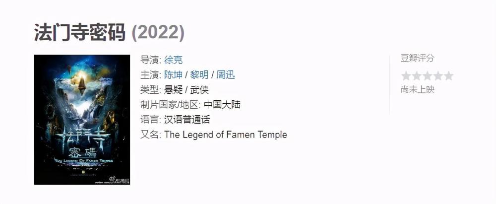 近年来,徐克不少电影都吊足了观众胃口。除了《摸金校尉之九幽将军》之外,集结了七大名导演的《七人乐队》同样让人期待,不少观众纷纷期待着能够早日看到这些电影上映。不过,徐克其实还有一部古装玄幻电影《法门寺密码》让人期待已久,而这部电影筹备至今已经整整4年了。 从豆瓣上更新的消息来看,这部《法门寺密码》要到2022年才能上映。其实,这部影片从2016年已经开始筹备了。 2016年,徐克就已经和上影投资共同启动了电影《法门寺密码》,徐克还坦言,希望摆脱妖魔鬼怪的传统视觉上的呈现方式,用现代科技原理来展现古代幻术奇观。而这部《法门寺密码》,还将结合中国历史文化和商业电影元素,带给观众全新的体验。 《法门寺密码》是一部武侠悬疑电影,改编自黄裳瑾瑜的同名小说。由徐克执导,姚岚操刀。 而说到悬疑电影,这些年徐克的《狄仁杰》系列也是颇有市场。比如10年前,由刘德华、李冰冰、刘嘉玲执导的《狄仁杰之通天帝国》,票房高达2.86亿。后来的冯绍峰、赵又廷、林更新《狄仁杰之神都龙王》,票房高达6.2亿元。前年,《狄仁杰之四大天王》,徐克也是获得了金像奖最佳剪接提名。而《法门寺密码》,无疑又将成为徐克下一部古装悬疑电影。 从《狄仁杰》三部曲和如今的《法门寺密码》来看,徐克对唐朝是情有独钟。 《法门寺密码》讲的是晚唐年间,段成式为了寻找“神宫”,卷入了术士世界,最终化解了一场人间浩劫的故事。 而在演员阵容方面,徐克也是秉承他一贯以来的高标准要求。从豆瓣资料来看,这部影片的主演是陈坤、黎明和周迅,可谓戏骨云集。 周迅和陈坤,之前在电影《画皮》的时候有过合作,这部电影也是留给观众很深的印象,对小编来说,也是承包了小编的童年阴影。两人的演技是有目共睹的,从现在的演艺圈来说,两人是绝对的老戏骨。 而继《画皮》之后,陈坤和周迅还合作过《诗眼倦天涯》,不少观众也是十分期待。 值得一提的是,这部《法门寺密码》的主演还有黎明。作为曾经“四大天王”之一的黎明,无疑是最低调的一个了,这些年影视作品也是很少,上一部还是古装玄幻剧《将夜》,他在里面扮演的是心怀大志、聪明睿达的唐王李仲易。小编认为,这个角色就是黎明的本色出演,李仲易收敛锋芒20余载,一出手却能够震惊朝野。 不得不说,这部影片是大咖云集。虽然筹备至今,已经整整4年,如今还是没有要上映的消息,不过好饭不怕晚,如果这部影片能如期在2022年上映,到时估计就是徐克的再次收割票房,大家期待呢? $ Z% X* U) b3 c
