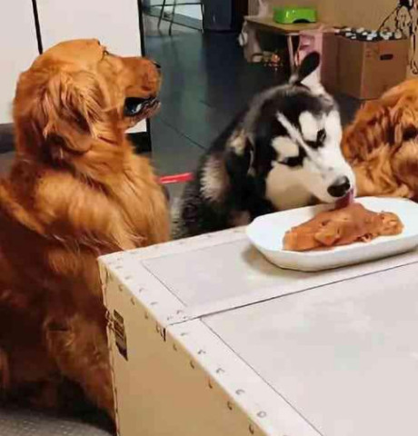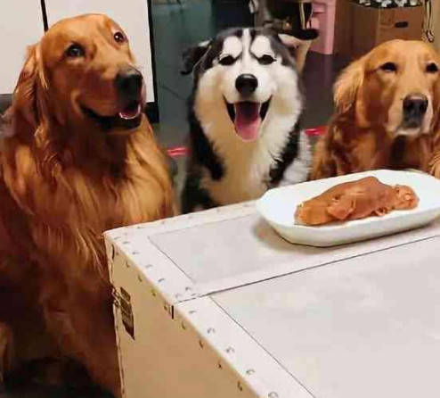 现在有越来越多的人养狗,不同品种的狗有着不同的性格特点,不管是金毛的暖心、哈士奇的蠢萌还是中华田园犬的忠诚护主,狗狗都一直深受人们的喜爱。另外,养一只狗还能给枯燥的生活增添不少乐趣,它们有着仅用一个眼神或者动作就把人逗翻的神奇能力。 有人说养宠物会上瘾,的确!这位宠主就是一个很好的例子,自从养了哈士奇之后就相继带回家两只金毛,聪明的金毛和蠢贱的哈士奇简直就是汪界的两个极端,三个活宝的相处日常总能把主人逗得开怀大笑。 这天,主人模仿网络上的办法测试哈士奇和金毛,把一只香喷喷的大猪蹄放在桌子上,吩咐它们不准偷吃后便假装离开。一开始三只狗狗都被大猪蹄吸引住了目光,口水直下三千尺,可过了一会,两只金毛心有不甘的离开了桌子,剩哈士奇独守前线。 哈士奇:“哎?两个大兄弟怎么走了呀?难道你们没想法吗?” 金毛:“眼不见为净,光看着有什么用,又不能吃” 哈士奇:“吩咐是死的,偷偷吃一点主人是不可能发现的” 金毛:“那你已经凉了,一首凉凉送给你” 哈士奇慢慢啃起了猪蹄,一开始还很谨慎,一小口一小口的吃,后来根本停不下来,犹如风卷残云一般。主人看回录像哭笑不得,可还能怎么办,自己选的哈,跪着也要宠。 网友看到这一幕都笑喷了,“金毛和二哈的差别高下立见”、”哈士奇能坚持这么多秒已经很不容易了”..... 9 Q3 v6 Z1 C# G& b: u0 `& ?