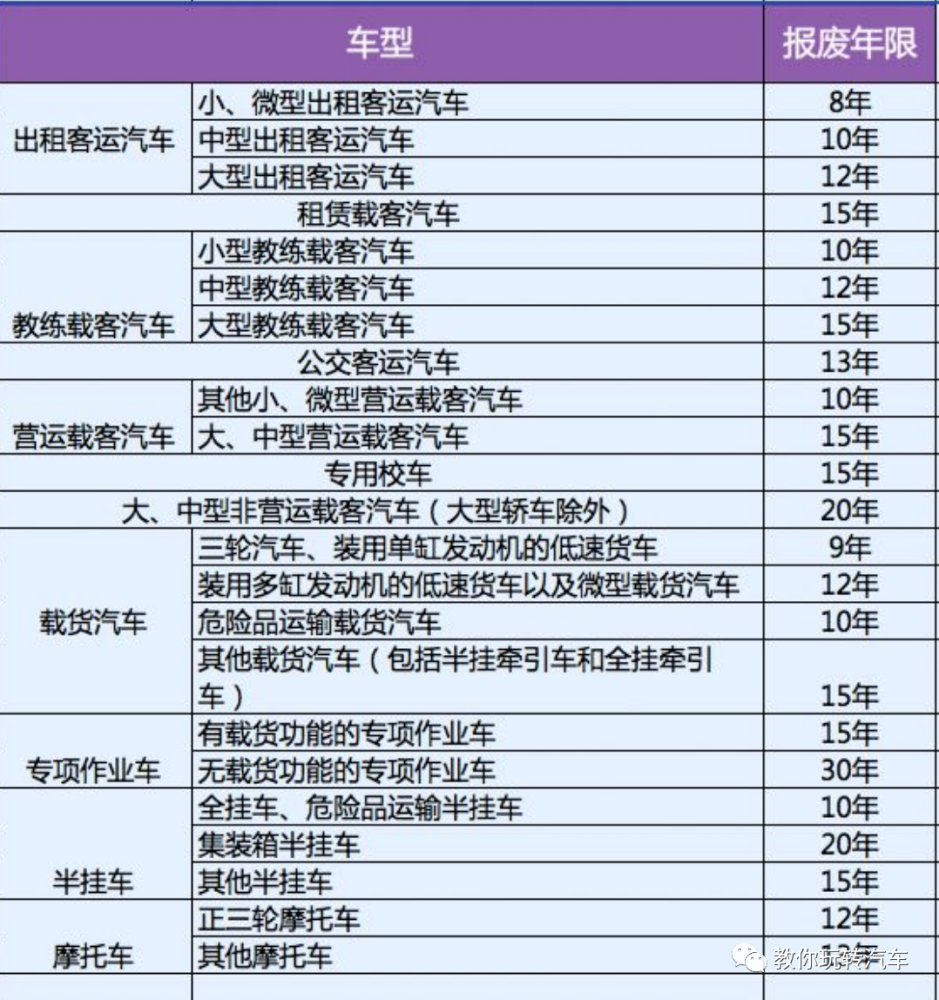 汽车使用年限一直是广受车友关注的问题,现在,15年的汽车报废年限终于取消了! 根据商务部印发的《汽车销售管理办法》、公安部部署的《机动车号牌改革》及《机动车强制报废标准规定》,汽车报废年限取消、车牌号终身使用等新政策全面实行!但是,关于汽车报废年限取消,有几个注意事项大家务必要仔细看! 车牌号可以终身使用 对于很多老司机来说,车牌多少都是自己精挑细选之后选出的。很多人都想一直使用一个车牌。以前的政策是如果想保留旧车牌,有很多附加的条件。而现在新政策却没有这样的限制了! 之前的规定是,旧车牌必须使用超过3年,才可以保留它。这让很多经常换车的司机朋友大感不快。他们的车牌往往没有使用超过3年,这就意味着自己的车牌无法换到新车上。 现在,对于车牌的限制也有了调整。新的车牌政策是,只要你的老车牌用满了一年就可以申请留下,并且可以永久保留。而车牌的保留时间也延长了半年,这样对于很多想要换新车的车主来说,不会因为提不到新车导致旧车牌报废了。 另外,之前旧车牌只能用到新车上,而现在新规出台,旧车牌也可以用于新买的二手车上。让很多老司机都大呼:真的是太好了! 15年报废年限取消,3种情况仍需报废 早年的时候私家车的强制报废标准为期限10年。在2000年《汽车报废标准规定》中,延长到15年。而新的《机动车强制报废标准规定》又做了新规定: 小、微型非营运载客汽车,大型非营运轿车,轮式专用机械车无使用年限限制。 也就是说:私家车15年强制报废政策取消!但是,私家车报废年限取消并不是说汽车永远不会被报废,下面这3种情况仍需报废。 1、行驶里程达到60万公里 国家对达到一定行驶里程的机动车引导报废。其中,小、微型非营运载客汽车和大型非营运轿车报废里程数是60万公里。 也就是说虽然没有报废年限的说法了,但是开到60万公里以后要被强制报废。不过小编相信基本不会有人把车开到60万公里的,就算有那也是极少数的情况。哪怕是一些经常出差的公务车,一年开3万公里,那也要开20年。 2、未通过年检或没有按时年检的 根据《机动车强制报废标准规定》,已注册机动车有下列情形之一的应当强制报废: (1)经修理和调整仍不符合机动车安全技术国家标准对在用车有关要求的; (2)在检验有效期届满后连续3个机动车检验周期内未取得机动车检验合格标志的。目前私家车的年检规定是:7座以下的新车6年一审,6年内每两年去车管所领证盖章,不用上线;7-15年内每年检一次;15年以后每半年检一次。如果大家不按时参加年检或者年检不合格,汽车将会面临强制报废。 “3个机动车检验周期”是多长时间?不是指3年,而是根据车辆用途、载客载货数量、使用年限等不同情况,定期进行安全技术检验的周期。比如一辆全新的7座以下私家车,根据“私家车六年之内2年一检”的规定,新车的周期就是2年,3个检验周期就是6年。若新车连续6年未年检,就会被强制报废。 3、超出国家的排放标准限制 这一条才是重点,也是影响爱车强制报废的关键!经修理和调整或者采用控制技术后,向大气排放污染物或者噪声仍不符合国家标准对在用车有关要求的,应当强制报废。 每出一个新的排放标准,就意味着将有一批老车要被淘汰。根据现有的排放标准,在一些城市国四上牌都很困难了,而国二国三更是已经走在了报废的路上。 此外,根据环保部发布的《国六标准征求意见稿》: 正式的国六标准已于2017年底正式出台,2020年正式实施。“国六”标准一旦实施,国三车可能被强制报废,国四车慢慢不允许上牌 ,国五新车可能贬值加快!但是,还需要注意的是:虽然私家车报废年限已取消,下面这些车型并没!有!取消!一旦到了年限就会面临报废! 此外,如果车辆提前报废,会下发相应的补贴。根据不同排量,不同工种的车型,在申请报废后,所获得的奖励补贴也是不同的。可参考下表