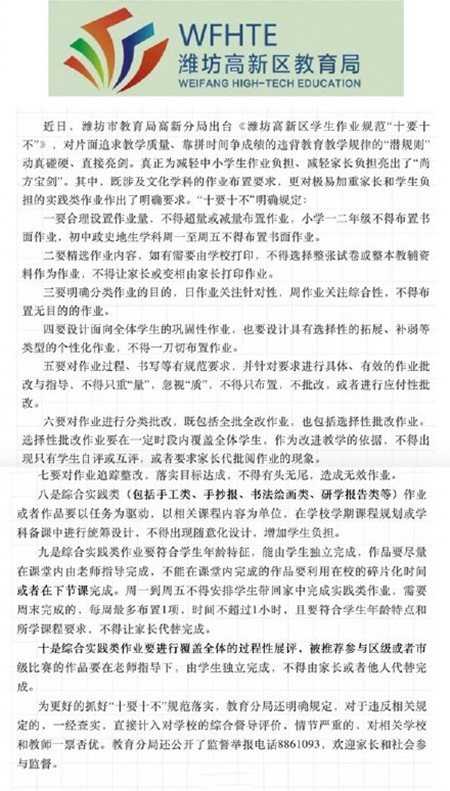 潍坊高新区禁止让家长批改作业# 你支持吗?近日,山东潍坊市教育局高新分局出台《潍坊高新区学生作业规范“十要十不”》,明确:小学一二年级不得布置书面作业;不得让家长或变相由家长打印作业;不得出现要求家长代批阅作业现象;周一到周五不得安排学生带回家中完成实践类作业。 近年来,幼儿园家长要手工全能,小学家长要辅导、批改孩子的作业,作为老师,我都觉得家长太难了。不该家长做的事,就不该让家长做,同样的,不该老师做的,也不该让老师做。不要权责不明,什么事大人都做,结果,孩子没得到培养和锻炼,倒是增添了大人许多负担。 我觉得家长的职责,是给到孩子一些对世界的理解,对人和事的理解和洞察,教会孩子怎么跟情绪相处。以及努力工作赚钱,给孩子提供看世界的条件。送孩子上学,老师和学校的职责是教授数理化知识,拓宽孩子视野,加深孩子的思辨能力。家长和老师,共同有义务让孩子养成来“自我负责”的习惯。但是要求家长干预作业,本身就是在破坏这种习惯。 看了一下潍坊高新区禁止让家长批改作业里的“十要十不”,涉及到的不仅仅是不让家长批改作业的事。这些规定都挺符合上面要求的,当然也挺符合有些家长的要求。但也很明显,会有一部分家长看到以后不满意并且会焦虑。尤其是前两条。“小学一二年级不得布置书面作业,初中政史地生学科周一至周五不得布置书面作业”,这一条规定下来,很多小学一二年级的小孩家长会变得更忙了。没作业就意味着回家了什么事没有,学校学的知识就完全靠在学校落实掌握。像我以前说的(图2),小学生在校时间那么短,课程都开齐开足,留给语数的课时并没有以前那么多。想让小孩多学一点的家长,那就只能靠自己在家布置作业或者让小孩报课外班来达到了。这么一来,增加的是一些家长的负担和烦恼。 关于初中生的这个要求,如果最终真的落实下来,想想有点可怕。前几天还在说现在初中生也挺辛苦的,这辛苦里面有太多的无奈。能怎么办呢?想上好一点的学校,就得考多一点的分数。中考跟小升初不一样,直接面临选择高中或中职,那就意味着会影响到高考。大部分初中生家长都不会让小孩这么放松。怎么办?报班?那同样的,又是增加一些家长的负担和压力。不让老师布置作业,会让很多想让小孩多学一点知识的家长烦恼。但没办法,上面就是这么规定的。这些年减负就是这么要求的。 第二条里“不能选择整张试卷或整本教辅资料作为作业”,是把其他年级的课后作业也连着规定了。不能让家长打印作业这个没问题,但学校打印的话费用哪里来?一般义务段学校也没这么多经费来天天给学生打印这么多试卷。现在很多都是统一买试卷吧?作业不能选择整张试卷。怎么办?半张?还是一张试卷抄掉几个题?上面要求一课一辅,这整本辅导资料也不行,不知道是一次整本不行还是一学期整本不行。没太明白。 我还是那句老话,批改作业还是得靠老师完成,家长可督促小孩完成作业。但如果没有作业,尤其是初中这些科目没作业,最终相应工作会落到家长身上。想学的学生和家长,其实一直都在默默努力较劲。不想学的学生和不想操心的家长,真的会省心不少了。
