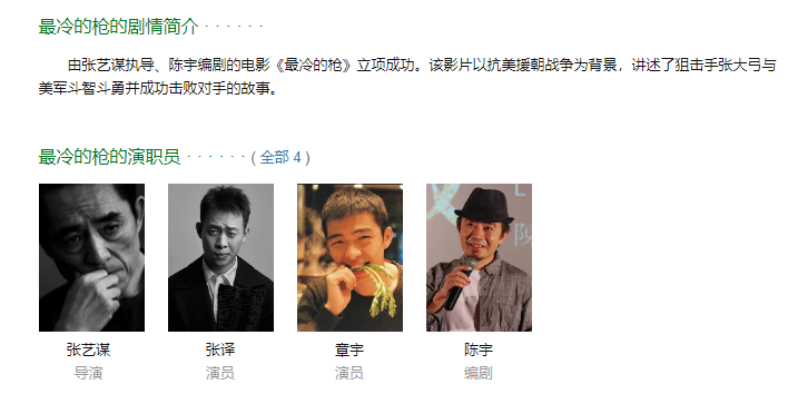 电影圈突然兴起了一股战争大片热,而且题材全部都瞄准了抗美援朝,比如说最近上映的《金刚川》就是抗美援朝大片,除了这一部电影之外,已经有很多类似的电影处在开拍和即将开拍的状态。 包括目前正在拍摄的《长津湖》,该片由陈凯歌、徐克和林超贤联合执导,吴京、易烊千玺领衔主演,讲述的是长津湖大战。 不过我们今天要讲述的是另外一部抗美援朝大片,该片的导演同样是顶级大导演执导,这部新片就是《最冷的枪》,由张艺谋导演执导。 这也是张艺谋导演最近一两年内拍摄的第四部电影,该片于前段时间曝光了剧情梗概,讲述的是抗美援朝时期传奇狙击手张桃芳的故事,他曾经在33天的时间里用442发子弹干掉了214人,创造了一个传奇。 这样的一个故事也引起了张艺谋的关注,在拍摄完《悬崖之上》之后,张艺谋就又投入到了《最冷的枪》的筹备当中。让人高兴的是,这部电影的演员阵容也随之曝光了。 据媒体透露,《最冷的枪》原本接洽的是易烊千玺,因为男主角就是一个二十多岁的小伙子,很年轻,易烊千玺比较符合,但是后来易烊千玺档期冲突,他去演了《长津湖》,于是演员又再度发生了改变。 张艺谋后来还是选择了他熟悉的演员来演,也就是张译,除了张译之外,据悉章宇也将加盟,可能章宇大家还有些陌生,但是他的电影大家都看过,他就是《我不是药神》中的那个黄毛,也是一个实力派,低调不炒作,最近越来越火,于是就被张艺谋所关注到了。 值得一提的是,张译和张艺谋可以说是很有缘分,两人的名字是谐音不知道大家发现了没,还有一个就是张译和张艺谋已经是三度合作了,如果算上现在的《最冷的枪》的话。张译最早和张艺谋合作的是《一秒钟》,该片讲述的是六七十年代的人与电影的故事,张译所饰演的就是张艺谋年轻时那个年代的人。 在这部电影之后,张译又去客串了张艺谋拍摄的谍战片《悬崖之上》,该片由张涵予、秦海璐、朱亚文等人主演,张译的客串又让该片蓬荜生辉。 再加上现在的《最冷的枪》,张译和张艺谋也确实是三度合作了,媒体也戏称张译成为了张艺谋的“谋男郎”,其实张艺谋继续选择张译的理由很简单,因为张译在圈内有着这样一个外号,叫做“谁用谁说好”,意思就是张译不管与哪个导演合作都会被夸赞,很容易被邀请再度合作,因为张译演技好、片酬低、低调不炒作,事情少,这样的演员确实是一个合格的好演员。 与《长津湖》相对比的话,《最冷的枪》更像是大集体中的个人视角,毕竟故事主要是讲述狙神张桃芳的故事,而《长津湖》是更加讲究团队作战,所以张艺谋导演所挑的这个角度非常好,单独挑一个人的故事来拍,可以将故事拍得更加细腻,拍摄的难度也相对较小一些,反映的是抗美援朝时期,小士兵的故事。 值得一提的是,现年70岁的张艺谋创作欲十分旺盛,最最近一两年已经接连拍摄了四部电影,分别是《一秒钟》《坚如磐石》《悬崖之上》和现在即将要拍摄的《最冷的枪》,状态可以说是非常不错了,张艺谋作为电影圈的“国师”,基本上每部电影还是有他的水准的,所以质量其实不用担心。 《最冷的枪》将于近期正式开拍,2021年下半年上映。 " U3 k1 w, }. g2 H3 E9 {0 {. W& d8 x