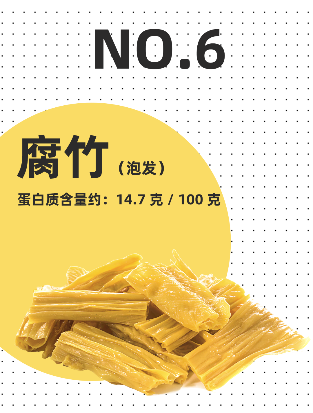 第一个上榜的就是大家爱吃的「腐竹」。通常它是干燥的状态,这里我们计算了它泡发后的蛋白质含量,大概在 14.7 克 / 100 克左右。0 ]; g& `) _$ k; v