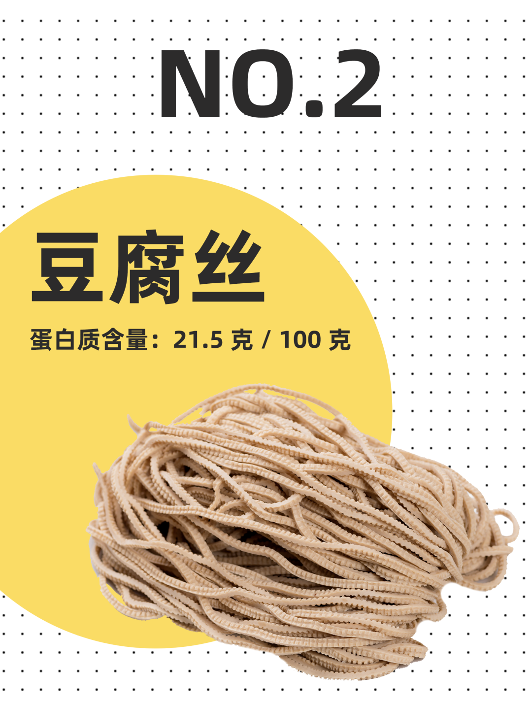 豆腐丝提供的蛋白质能达到 21.5 克 / 100 克,但单独吃有点单调,搭配菠菜、胡萝卜丝、黄瓜丝等一起,口味丰富还更营养噢。