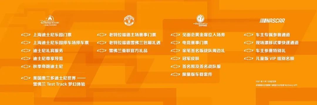 今年,为了回馈650万车主,雪佛兰首次推出了50项车主特权,其包含了4大类别7大系列,包括了雪佛兰车主可以兑换上海迪士尼门票,尊享迪士尼贵宾服务,还能收获独家放送的秋季奇跑迪士尼名额。另外,车主也有机会获得2020-2021赛季曼联英超主场比赛的门票、iG战队电竞赛事门票。而这50项车主特权将于2021年1月1日起生效。