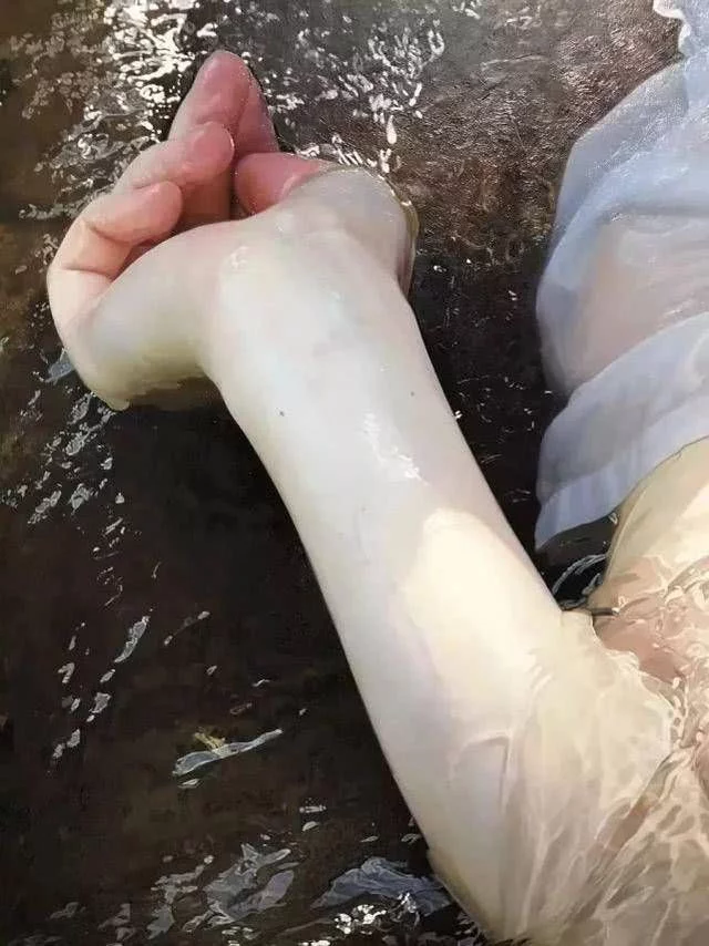 尴尬的是,这幅画上传后,居然被网站后台的机器人,识别为照片。而三重野庆的账号,也直接被封禁,理由是不诚实,这种行为属于欺骗的行为。为了维护自己的名誉,三重野庆向该网站提出申诉。更郁闷的是,连人工专家看了三重野庆的这幅作品后,居然也不相信它是一幅画。三重野庆只得将画画的细节和过程,录制成视频的方式加以说明。到底这幅画有多大的魅力。我们不妨将作品放大十倍,一起来欣赏其中的细节。细节太多,我们只挑这幅水中少女的手臂来对比。大家不妨参照下面的图片。