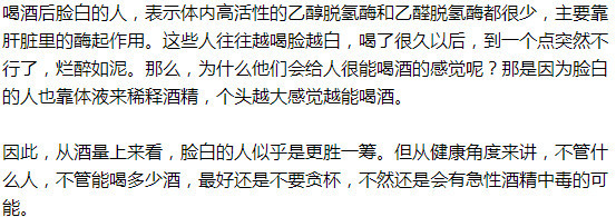 都说岁月是把杀猪刀,其实酒精才是。 没了这把刀,生活会怎样? 外国网友们po出了自己戒酒前后的变化,结果一目了然。 发现了吗?戒酒之后,他们精神好了、人变瘦了、外貌也更好看了…… 英国皇家自由医院的一项研究发现,戒酒后身体的恢复几乎“立竿见影”。戒酒一个月,就能促进受损肝脏的恢复、降低血压和胆固醇水平。 常有人说:“喝酒脸红的人不易醉,喝酒脸白的人酒量好”?真的是这样吗? 喝酒脸红的人不易醉? 很多人都误以为脸红是酒精导致的,其实不然。乙醇(酒精)进入体内后,先由乙醇脱氢酶将它转化成乙醛,而乙醛具有让毛细血管扩张的功能,一扩张脸就红了。 不过人的体内还有一种酶,叫乙醛脱氢酶。喝酒脸红的人是只有乙醇脱氢酶,而没有乙醛脱氢酶,所以乙醛在人体内迅速累积却不能代谢,因此才会出现长时间的脸红状态。 不过常喝酒的人也都有经验,一般几个小时后红色就会减退,这是靠肝脏里的细胞色素酶慢慢将乙醛转化成乙酸,慢慢被代谢掉了。 喝酒脸白的人酒量好? 究竟谁酒量更好些? 事实上,最能喝酒的人既不是喝酒脸红的人,也不是喝酒脸白的人,而是喝酒满头大汗的人。 酒量好是体内同时具有高活性的乙醇脱氢酶和乙醛脱氢酶的这类人。一般这类人边喝酒边会大量出汗,酒精会随着汗液迅速被排出体外。如果酒桌上碰到这类人,最好还是不要跟他们干杯了。 今天就带你看看,这些年酒精对你做过什么,给你一个不再喝酒的理由。 一杯酒,引发200多种健康问题 “感情厚,喝不够;感情铁,喝出血。” “宁可胃上烂个洞,不叫感情裂条缝。” …… 这样的劝酒辞砸过来,即使身体不适、不想喝,有些人也会迫于“不喝是不给面子”的压力喝几口。 与很多人以为的“小酌怡情”不同,著名医学期刊《柳叶刀》发表的一篇文章显示,酒没有安全剂量,只喝一点也有害。中国男性饮酒率达48%,饮酒死亡数量全球第一。 饮酒与200多种健康问题有关。 肝脏疾病 大部分酒精在肝脏代谢,醉酒对肝脏的伤害不亚于肝炎。 长期饮酒可造成酒精性脂肪肝、酒精性肝炎、酒精性肝硬化等疾病,严重者会伴随严重腹水、肾功能不全、消化道出血等并发症。 癌症 世界卫生组织把酒精列为一级致癌物。 全球5.5%的癌症由酒精引起,每18个癌症里就有一个是喝出来的,其中口腔癌、喉癌、食管癌与之关系最密切。 戒酒20年后,患这些恶性肿瘤的风险和从不喝酒的人相差无几。 痴呆 大量饮酒可能造成慢性酒精中毒,引起酒精中毒性痴呆等。 心脏病及中风 饮酒可使血压升高,引起心脑血管疾病,增加突发冠心病、心力衰竭、心脏骤停、颅内出血(中风)等风险。 胰腺炎和胃溃疡 大量饮酒会刺激胰腺分泌,容易导致急性胰腺炎,胃溃疡及胃癌发生风险也会增高。 心理疾病 长期饮酒易影响心理健康,变得以自我为中心,义务感、责任感降低,也可表现为焦虑、抑郁,在慢性酒精中毒者中,有6%~20%患者有过自杀行为。 此外,饮酒后人的思维判断能力下降,约22%的工伤与饮酒有关,43%打斗受伤者体内酒精浓度较高。 因此,每一场酒局都是对生命的透支,是慢性自杀。 国人酒精代谢存在基因缺陷 与欧美人相比,亚洲人对酒精更为敏感。 酒精在人体内代谢主要有两个步骤: 第一步 在“乙醇脱氢酶”的作用下,将酒精分解为乙醛。 第二步 在“乙醛脱氢酶”的作用下,将乙醛分解为没有毒性的乙酸。 中国人的乙醇脱氢酶活性较高,第一步代谢很快完成。 遗憾的是,约1/3中国人存在乙醛脱氢酶突变,第二步无法有效进行,于是大量乙醛滞留体内,产生脸红、心悸、恶心等不适。 世界卫生组织已将乙醛列为一级致癌物,喝酒上脸的人更易受其影响,患癌风险更高。 值得一提的是,酒量大的人,只是对酒精耐受了,但喝酒越多体内积累的乙醛也越多,对身体的伤害更大。 喝酒,最好别超过这个量 美国建议男性每周饮酒量上限为196克,女性是98克。意大利、葡萄牙等国比美国的限值要高,英国则是美国的一半。 来源:《中国居民膳食指南》 饮酒限量只是一个相对的安全值,对于个人,特别是女性来说,建议能不喝就别喝,即使喝也要尽量少喝,不存在“适度饮酒”的说法。 孕妇、儿童、青少年应禁酒,包括传统的醪糟。 学几招降低酒精伤害 要想避免酒精带来的伤害,最简单的方法就是不喝酒。不得不喝时,建议做到以下几点,将酒精伤害降到最小。 1 喝酒前吃点东西 喝酒前先吃点东西垫一下,能减少酒精对胃壁的刺激,延缓酒精的吸收,并且摄入一些酒精代谢所必需的营养物质。 推荐的食物包括奶类、豆浆等蛋白质饮料,苹果、南瓜等富含果胶的果蔬;全麦面包、杂粮粥等富含淀粉和B族维生素的食物。 需要注意的是,“解酒药”之所以让人感到清醒、舒服,是因为含有利尿、止痛和兴奋的药物成分,能够缓解头痛、恶心症状。但这些成分不能真正“解酒”,反而加重肝脏负担。 2 选低度酒,小口慢喝 在同等量下,高度酒对肝脏等器官的损伤要大于低度酒。喝酒要慢些,小口喝,一通猛灌不仅易醉,而且对胃等器官的损伤更大。 3 不要用饮料兑酒 酒兑饮料,让酒精更快地通过血脑屏障,容易造成慢性酒精中毒。 饮料里的碳酸会加速酒精在胃里的渗透作用,更刺激胃肠道;酒精在碳酸的作用下,吸收速度更快,还易诱发急性胃肠炎等疾病。 4 白酒和黄酒温着喝 在烫热过程中,甲醇、醛、醚类等有机化合