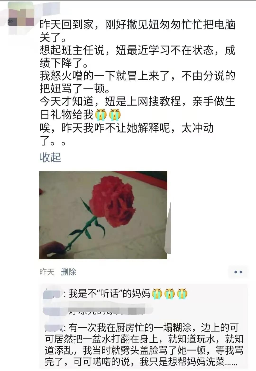 前几天,朋友发圈说:我是「不听话」的妈妈。 原来,她回家刚好撞见孩子偷玩电脑,想起孩子成绩又下降了,便对孩子劈头盖脸一顿骂。 后来才知道,孩子是上网学做康乃馨,想给她一份特别的生日礼物。 顿时觉得又窝心、又惭愧,怪自己冲动。 有朋友在下面留言说:她在厨房忙得不可开交时,孩子把一盆水打翻在身上了。她觉得孩子捣蛋添乱,恼了。 就在她骂完后,孩子说了一句「我只是想帮忙洗菜」,让她又感动又自责。 我们总在感叹自己操碎了心,孩子却一点都不懂事。其实我们的孩子什么都懂,他也会小心翼翼地去爱和付出。 很多时候不是孩子不听话,而是我们不「听话」。 前段时间,袁咏仪在某综艺节目上自曝,她和儿子的关系一度非常紧张,儿子不愿和她多说一句话。 有一天,儿子还很认真地和爸爸说:「我想换个妈妈!」 为什么呢? 心理医生告诉袁咏仪,问题不在孩子,可能是她太以自我为中心了。 比如,有些事情,她觉得对孩子来说不好,就会不由分说直接拒绝。 儿子考试考砸了,她上来就劈头盖脸指责,孩子连辩解的机会都没有,只能把所有的心里话咽下。 一次又一次,一天又一天,儿子对她越来越不满,越来越反感。 好好的亲子关系,硬生生成了「仇人」关系。 现实中很多孩子,越长大,和父母的话越少。 表姐就不止一次抱怨,读小学五年级的侄子几乎和自己无话可说。 放学回到家,说一句「妈,我回来了」就径直进了房间,把房门一关。更多时候,连这一声招呼都没有。 她小心翼翼敲开房门,问孩子:「今天在学校怎么样啊?」 侄子就一句「挺好的」,她想再多问几句,孩子就一句话「打发」了:「我要写作业了。」 好几次,她在饭桌上问起孩子的学习情况,侄子总不耐烦地说:「说了你也不懂。」 我问过侄子为何如此,他说:「以前和妈妈说话,她要么没时间,要么总盯着手机,我都说完了,她还在问‘什么?’」 我们总在感叹,和孩子怎么越来越无话可说了? 很多时候,大人一次又一次粗暴的打断,一次又一次听而不闻,忽略了孩子想要与我们交心的渴望。 想要孩子多说,我们首先要学会听。 行为心理学家说,孩子的每一个行为背后,都隐藏着一个诉求。 孩子不听话、不交流甚至哭闹,一定是有诉求没有得到回应和满足。 曾看过一个视频,一个3岁的孩子,一言不合就哭闹,每天都要哭很多次。 没买玩具,哭!不让吃零食,哭!不理他,也哭! 手忙脚乱的妈妈很无助,但却一直没有意识到问题在哪里。 当孩子兴高采烈地和妈妈诉说时,她只是简单地敷衍:嗯、好、哦。 当孩子追着妈妈问问题时,她总不耐烦地说:咋这么多问题。 她的语言特别单一,只会要求,只会指令,评价,永远都是「你该做什么」,从未问过孩子「你想做什么」。 母子之间「沟」而不通,孩子的诉求也就一直得不到满足。 所以孩子才会通过不断哭闹的方式引起妈妈的注意,在得到回应的同时也会不断地去验证心中的一个判断: 只有不断地哭闹,妈妈才肯听我的话。 孩子所有的不可爱,不过都是在呼唤:妈妈,听我说。不管孩子多大,都有被倾听的需要。 《少年说》中,就有个女孩因为很久没有好好和妈妈说话了,感觉备受冷漠,觉得妈妈不爱她了。 她说:「妈妈工作很忙,我们很少有机会讲话。妈妈就算在家,也是一天到晚地接电话。 我不知道为什么她有那么多时间听别人讲,却没有时间听我讲。 记得有一次,我打电话给她,刚开始一直忙音,好不容易接通了,但她用特别冷漠的语气问我有什么事。」 说到伤心处,女孩数次哽咽。 最后,女孩问:「妈妈,你是不是没有以前那么爱我了,如果是,你能不能再爱我一次?」 语言,是情感交流的通道,更是通往心灵的窗户。 给孩子时间去说,才能了解他的想法和感受;关注孩子真正想要传达什么,才能更好输出你的爱和关心。 心与心的贴近,往往始于倾听。 亲子教育家王小骞说:「跟孩子沟通的时候,父母一定要牢记,‘听’动作永远要大于‘说’。」 很多父母可能会觉得,不就是听孩子说话吗?听就是了,怎么不会呢? 可真是这样吗? - 让孩子说完,是对他最基本的尊重# F9 ]2 `; d( d1 y }& X; A( S- f7 ]% Q