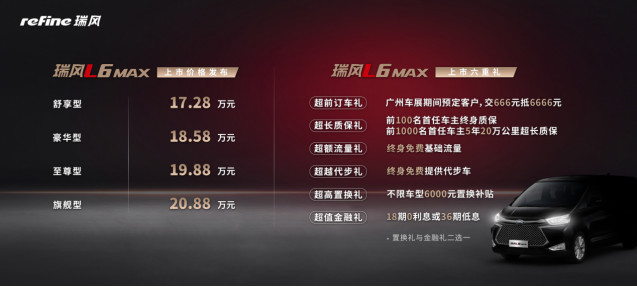 11月20日,“20万级前驱超空间商务MPV”瑞风L6 MAX于广州车展正式上市,定价17.28万元-20.88万元。作为瑞风品牌全新旗舰车型和瑞风“L”系列第一款产品,瑞风L6 MAX兼具前置前驱专业底盘、超大多维空间、20万级商务气质三大亮点。面对不断商务化的市场趋势和日益精细化的用户需求,瑞风L6 MAX的入场将带来“大 有前程”的中高端公商务出行体验,创造出兼具品质感和高价值的出行解决方案。 ) v- w# N. A5 Z3 D% k! D( }: I
