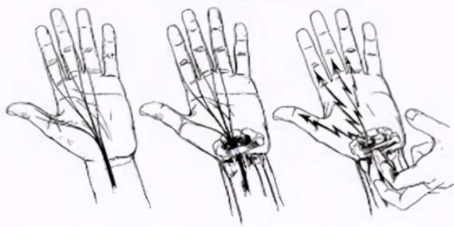 已经仿佛听到了回答的声音,脖子!腰!不过除此以外呢?低头看看自己的手腕,看看腕部掌侧的皮肤颜色有没有变深变硬变厚长茧了?如果有,“恭喜”,可能中奖了。接着自查一下,按着还疼不疼?平时有没有觉得手指、手掌有点麻木酸胀? 关注骨科大夫公众号:gukedf 了解更多骨科科普资讯 如果上述全中的话,那您一定要重视了,要不然慢慢可能会发展到手部活动僵硬,协调度下降。结果就是开车握方向盘不舒服,买菜拎东西也难受,甚至晚上睡觉的时候,手也觉得好像有电流通过,酥酥麻麻的。 如果真的到了这个时候,可能不得不遗憾的通知您,您可能得了一种听说过没见过的病——“鼠标手”。 所谓“鼠标手”,在医学上的术语叫做腕管综合征,是正中神经在腕管内受到卡压而引起的手指感觉及功能障碍的疾病,是极为常见的周围神经卡压性疾病。 是不是有一种都是汉字,放到一起都不认识的感觉? 其实很好理解,腕管就是一个隧道,中间走着正中神经,如果隧道变窄了,正中神经势必就要受到挤压了,那神经受到挤压了,肯定要出现相应的症状。可是好好的隧道,为什么会变窄呢? 这可能有很多原因,比如腕管内的滑膜增生、纤维化,创伤或者退行性改变导致的骨质增生、异常。 但目前,还有一种可能的原因就是长时间过度使用手指、手腕,比如码农们在电脑前打字或用鼠标,造成腕管内压力增高,这也可能是近些年腕管综合征发病率直线上升的主要原因。 问:大夫啊,那我以后不用鼠标是不是就不会得鼠标手了? 答:NoNoNo! 还真不是这样的。 腕管综合征并不是只有使用鼠标的人才会被盯上,用腕过度的工作群体都可能得到它的青睐。比如教师、司机、厨师、裁缝……这些长期进行手指手腕屈伸运动的人员都可能引发腕关节软组织劳损,局部组织增生、水肿,进而压迫正中神经。 除了以上这些“职业病”,任何能引起腕管变狭小或腕管内容积变大的因素(腕管内肿物、腕横韧带肥厚、桡骨下端骨折对位不良,以及伴有类风湿病、糖尿病等或孕期哺乳期雌激素水平的变化引起的组织水肿),都可导致腕管内压力增高而正中神经受压,即出现腕管综合征。 问:听说颈椎病也会手麻,那我到底是怎么回事? 答:没错,神经根型颈椎病和腕管综合征都会引起手麻,因为作为周围神经的正中神经的上游也是从颈椎的神经根发出的,所以临床上确实也容易混淆。不过,并不是无从鉴别的,只不过需要专业的医生而已。现在把秘诀告诉大家! 要鉴别这两种疾病,应从以下几个方面着手: 1.首先用另一个手轻轻敲击患手的掌侧腕横纹处,如果手指有放电样感觉,也就是临床上所说的Tinel氏征阳性,则腕管综合征可能较大。 Tinel征检查法 2.极度屈曲腕关节60s,如下图所示的区域麻木感加重(腕管极度屈曲试验阳性),考虑为腕管综合征。 3.腕管综合征压迫的是腕管内的正中神经,该神经支配的感觉区域有拇、食、中指以及无名指靠近中指的一侧,换句话说,出现了其他区域的麻木,比如小指、胳膊麻木,基本可以排除腕管综合征。 当然,这些都是查体的检测方法,腕管综合征的确诊最重要的还是临床检测。神经肌电图就是一个重要手段,它可以测出神经在哪一段出问题了。而且在神经肌电图检查中,腕管综合征的正中神经远端潜伏期延长,提示可能为正中神经卡压。除此以外,颈椎的核磁共振也可以很直观的看出是否患有神经根型颈椎病,加以鉴别。 明确诊断后不幸加入到腕管综合征阵营,该咋办? 对于尚未出现肌无力、肌萎缩等症状的早期腕管综合征患者来说,腕部夹板或支具固定不失为一个好的选择,也是最常见的保守治疗方法。将腕关节固定,保持制动后,通过减少其活动以期降低腕管内压力,缓解症状。 但也不是随便怎么固定都可以的,需要将腕部固定于中立位,因为此时的正中神经受压最轻,效果最佳。固定疗法可全天进行,也可夜间进行,两者对缓解症状及改善手部功能均有良好的近期效果,远高于自行缓解率。 如果夹板固定后仍不能缓解疼痛,可以考虑糖皮质激素注射治疗,也就是我们常说的“打封闭”。 不过这个操作有一定争议,因为它虽能够显著缓解症状,但中远期效果一直不算很理想。而且腕管内注射可能损伤正中神经,需要临床经验丰富的医生进行处置。 手术治疗 如保守治疗2 ~7周症状仍不能缓解或已经出现肌肉萎缩,麻木感难以忍受的腕管综合征患者,可以考虑采取手术治疗。无论何种手术方式,其目的都是解除正中神经压迫。手术治疗的成功率总体上显著高于保守治疗。手术治疗即腕管松解术,主要包括腕管切开松解减压术和内镜下腕管松解减压术。 - 腕管切开松解减压术因操作简便、安全,术后并发症发生率低等优点,已广泛用于治疗各种腕管综合征。该方法减压彻底,不仅切断腕管内腕横韧带,还将皮肤至正中神经之间的覆盖组织也一并切开,并常规进行神经外膜松解。但切口较大,手部功能恢复时间较长。