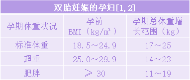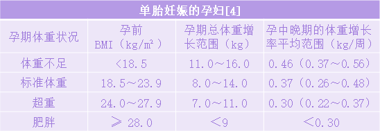孕期体重的变化不仅能体现孕妇是否健康,也能直观地判断肚子里宝宝是否健康成长。孕期体重增加与孕妇孕前胖瘦相关,可以根据孕前 BMI 来对比判断。 BMI 是身高体重指数,具体的算法是: BMI = 体重(kg)/ 身高(m)的平方。 比如,一位女性在怀孕之前身高 1.6 m,体重 50 kg,那么她的 BMI 就是 50 / 1.62 = 19.53,属于标准体重的范围。 1. 单胎孕妈妈 根据准妈妈的孕前体重状况,可以参照以下孕期体重增长建议: 2. 双胎孕妈妈 至于双胎妊娠的孕妈妈,由于中国没有相应的标准,给大家参考一下美国的标准。 简单点来说,健康的准妈妈整个孕期体重增长控制在 12kg 以内就可以。 如果孕前体重正常,那么在孕早期,只需要增加约 0.5~2.0kg 的体重即可,不要超过 2kg。 到孕中、晚期,也就是孕 4 个月之后,体重不足的每周增加约 0.5kg,体重正常的每周增加约 0.4kg; 对于超重准妈妈,孕中晚期每周体重增加约 0.3kg;BMI 为 30 或更高的准妈妈,每周建议增加 0.2kg。更泛一点的话,「半斤八两」就是每周体重增长的范围[2,3]。