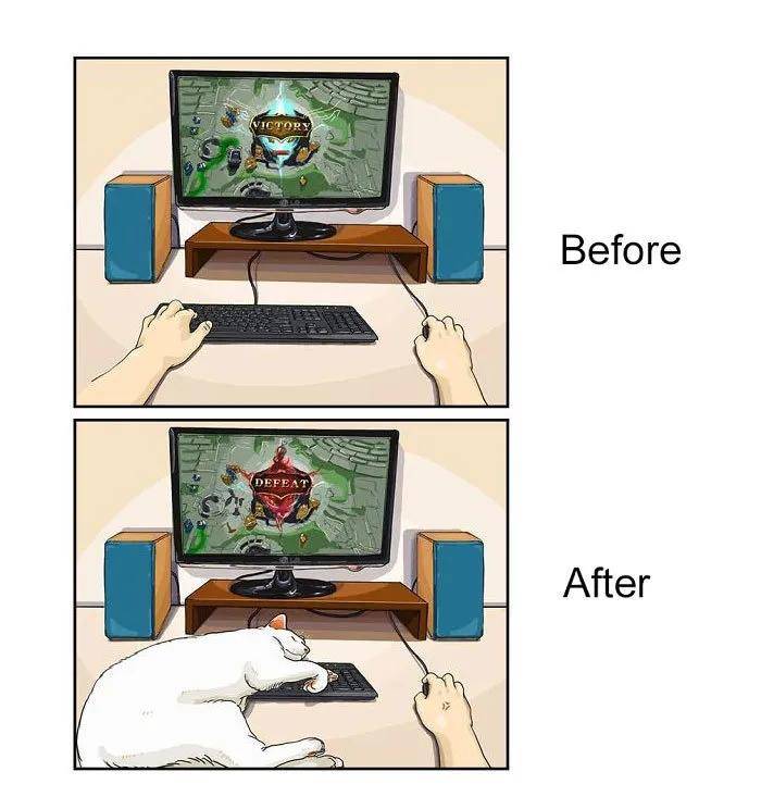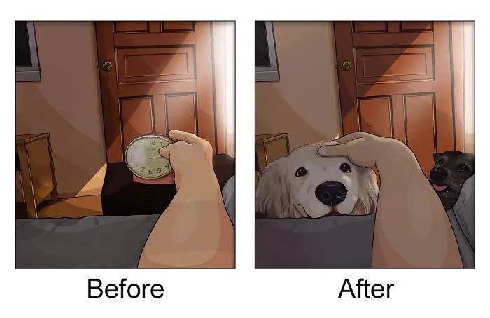 正所谓,没有对比就没有伤害!自打养宠物后,铲屎官生活发生了哪些改变呢? 有网友这么总结: 懒觉?什么是懒觉?哪怕是早上困得睁不开眼,订闹钟也要起来遛狗。想睡懒觉?不存在的。 无聊?什么是无聊?自打养了宠物之后,就没有无聊过。即便你自认为已经没事了,它也总能给你找到事儿干。 孤独?什么是孤独?看到它的那一刻,早就忘了什么是孤独。 疲劳?什么是疲劳?养宠物之前,走上一个小时的路,感觉好累。养宠物之后,遛狗一个小时,这才只是刚刚开始。身体素质也有显著提高。 宅家?什么是宅家?宅这个字和我没关系。养宠物之前,没事只想宅在家,能不出门就不出门。 夜晚不回家?怎么可能不回家?养宠物之前,晚上下课之后,外出和朋友嗨,嗨到凌晨都没关系。养宠物之后,晚上下课之后:不好意思,我要回家遛狗。 小气?怎么可能小气?给宠物买东西不心疼!养了宠物以后,就会变得像一个“老母亲”一样,总是变着法儿地想着对自家宠物好。别人家有的东西,必须给自家宠物置办上。 “高血压”?是的!经常高血压犯!宠物带来欢乐多,但麻烦同样也不少。就拿拆家这一点来说吧,就足以让人崩溃。家里的各种桌子腿儿凳子腿以及拖鞋袜子耳机线,每隔一段时间就会要换新。经济损失倒是可以忽略,但气可真是想不生都难。宠物每次犯了错误,都会眼巴巴地瞅着主人,主人这有气都没地方使,搞得自己时常觉得“高血压”犯了。 现在来赏析这组养宠物后生活变化的超写实漫画。