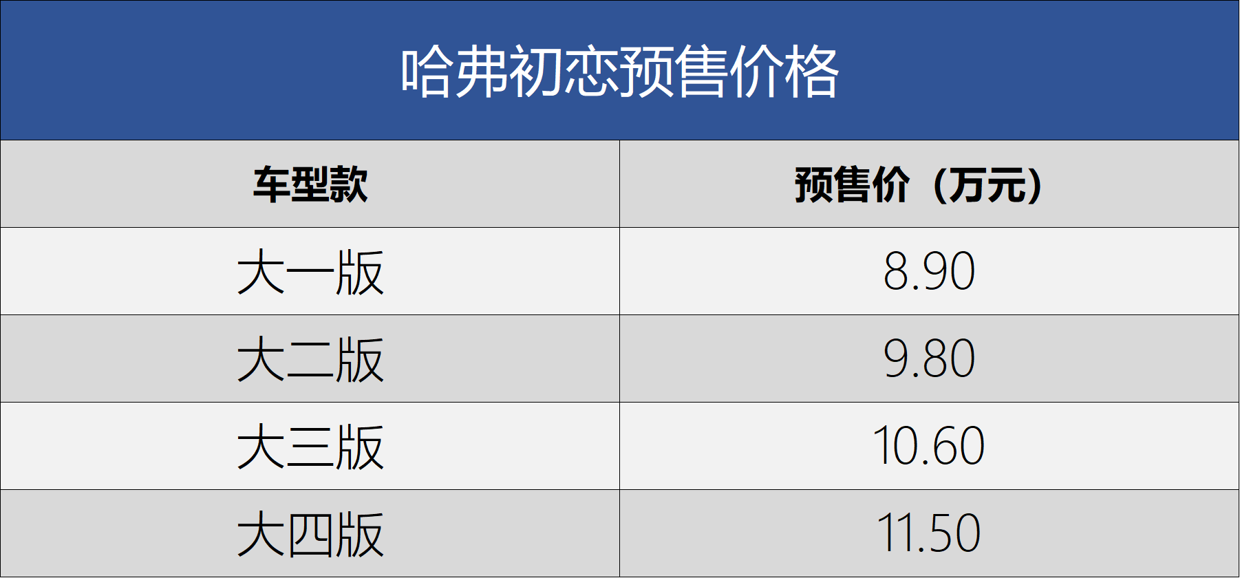 日前,哈弗汽车官方宣布,旗下全新小型SUV——初恋将于12月内正式上市。新车已于此前广州车展中开启预售,预售价区间为8.9-11.5万元。同时,新车是长城柠檬平台旗下的第三款新车,并采用了独特的命名方式。 外观方面,哈弗初恋采用了哈弗最新的家族式设计语言,类似泪眼的大灯组造型,内部则用复杂的灯腔进行点缀,配合多边形前格栅以及贯穿式进气口,让新车辨识度得到很好地提升。 车身侧面,新车的腰线设计较为流畅,由前大灯贯穿至尾灯处,提升运动感。尾部方面,新车采用了与前灯组相似的尾灯组造型,巧妙地形成了前后呼应的效果。同时,其下方内嵌的牌照区域造型以及下方防擦护板,进一步增加该车的层次感以及时尚感。 内饰方面,新车整体采用了深色与浅色撞色的色彩运用,并在中控台、三辐式多功能方向盘、旋钮式挡把区域以及车门把手附近加入玫瑰金饰条进行点缀,冷暖相容的色调就像它的名字一样,文艺且有个性。 配置方面, 哈弗(参数|图片) 初恋(参数|图片)将搭载了HUD智能抬头显示、座椅加热等配置,进一步提升该车的用车感受。动力方面,参考申报信息来看,新车将搭载由长城汽车股份有限公司所生产型号为GW4G15K的1.5T涡轮增压发动机,其最大功率为150马力。