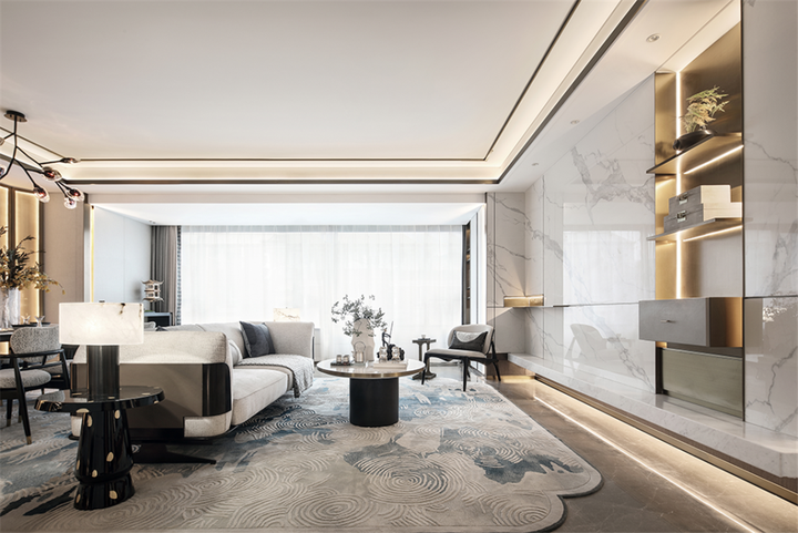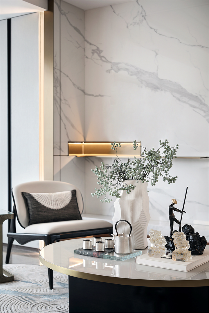 4 q4 G# p3 K; ?. `* v9 l8 i5 w通顶的柜体带来稳重的视觉效果,既展示了主人的生活品位,又给家庭的收纳的带来空间。而金色作为跳色则带有几分高贵和明媚,与整体素雅的家具搭配,中和了过分的简约感,增添了一丝时尚感和东方意蕴。