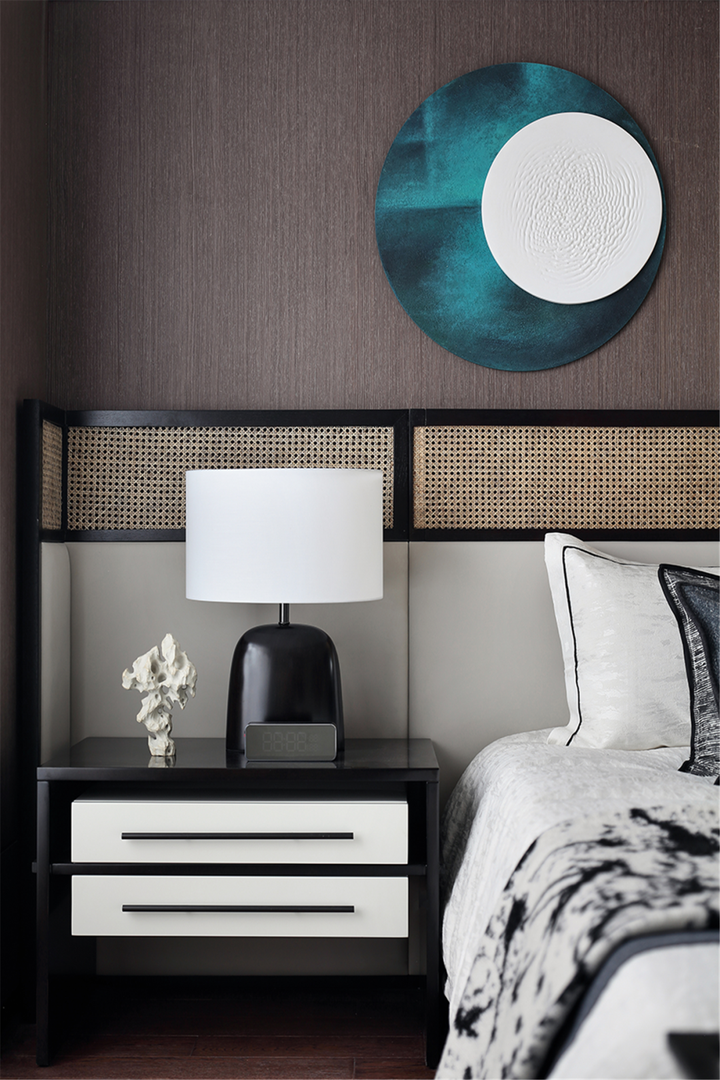 4 d) @1 \& B, B3 y通过块面整体分割的手法,床头悬挂的墨绿色装饰画,恬静、优雅、富有诗意,搭配背景墙延伸而来墨色线条,东方式雅致风华之美不言而喻。