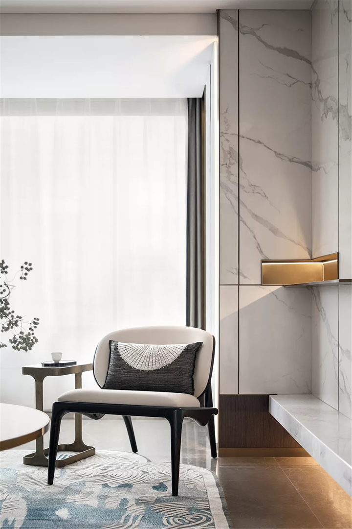 当代东方人的生活方式已与旧有格局和传统形式相脱离,着力于“取意”、强调“宜简不宜繁”,简洁的墙面线条、墨色的抱枕和中式方正的靠椅,将古之妙韵融合进现代生活,打造符合当下生活理念的居住空间。( K) i, K- i9 D3 u. k4 \. Z4 y& q