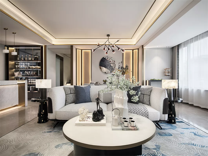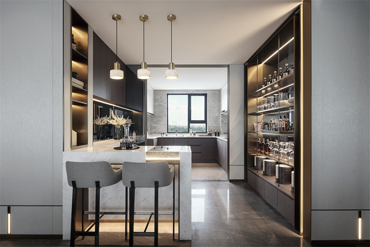 以过道为中轴,客厅、办公区、餐厅、西式吧台安然落座,确保整体视野广阔,空间方寸毫不浪费且功能极为融合。
