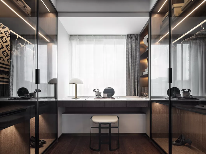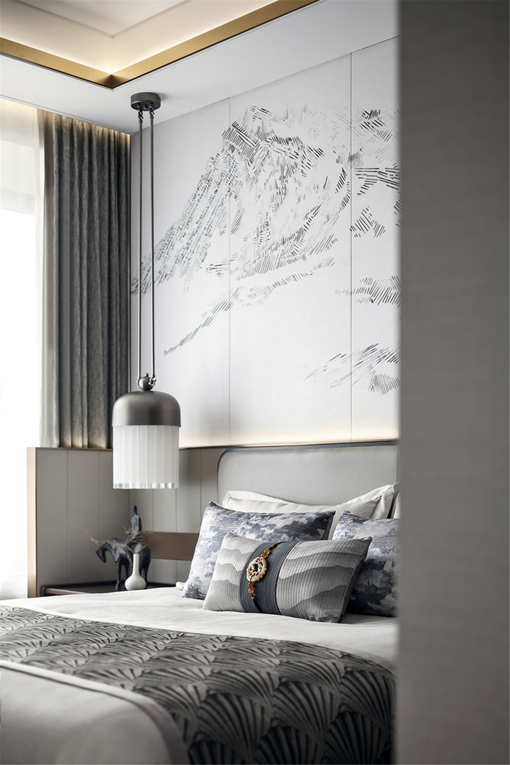 卧室的细节处理也颇具巧思。主卧的大开间落地窗,窗纱隔绝了世外纷扰,给空间留有一片静谧与安逸;又有光影略进阁中来,赋予美以戏剧性,尽显主人高贵的气质。