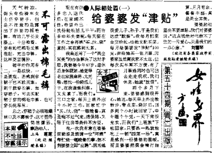 ■1993年10月的《新民晚报》刊登读者提醒(图左):穿裙子不可露出棉毛裤。