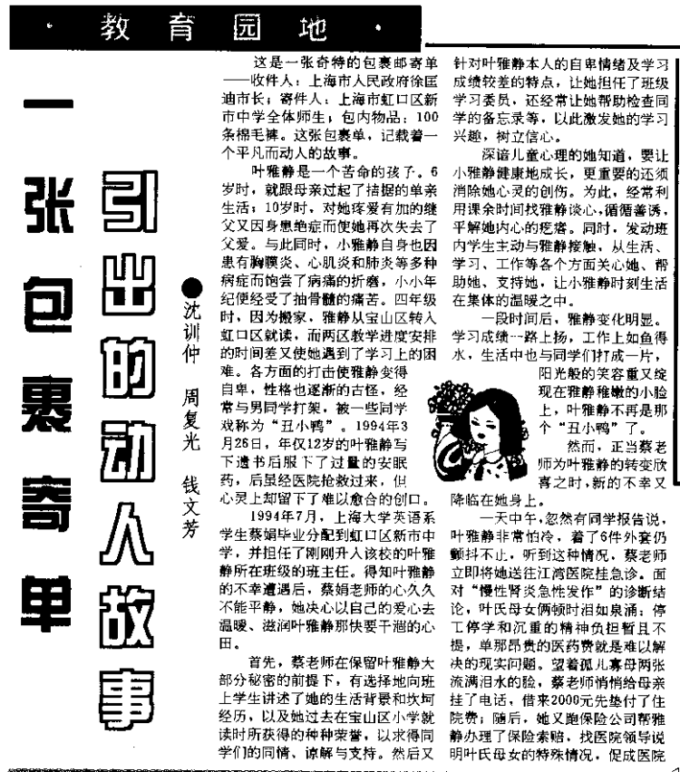 原来,当年虹口区新市中学的学生叶雅静看到一条电视新闻:徐匡迪市长视察云南贫困地区人民生活。