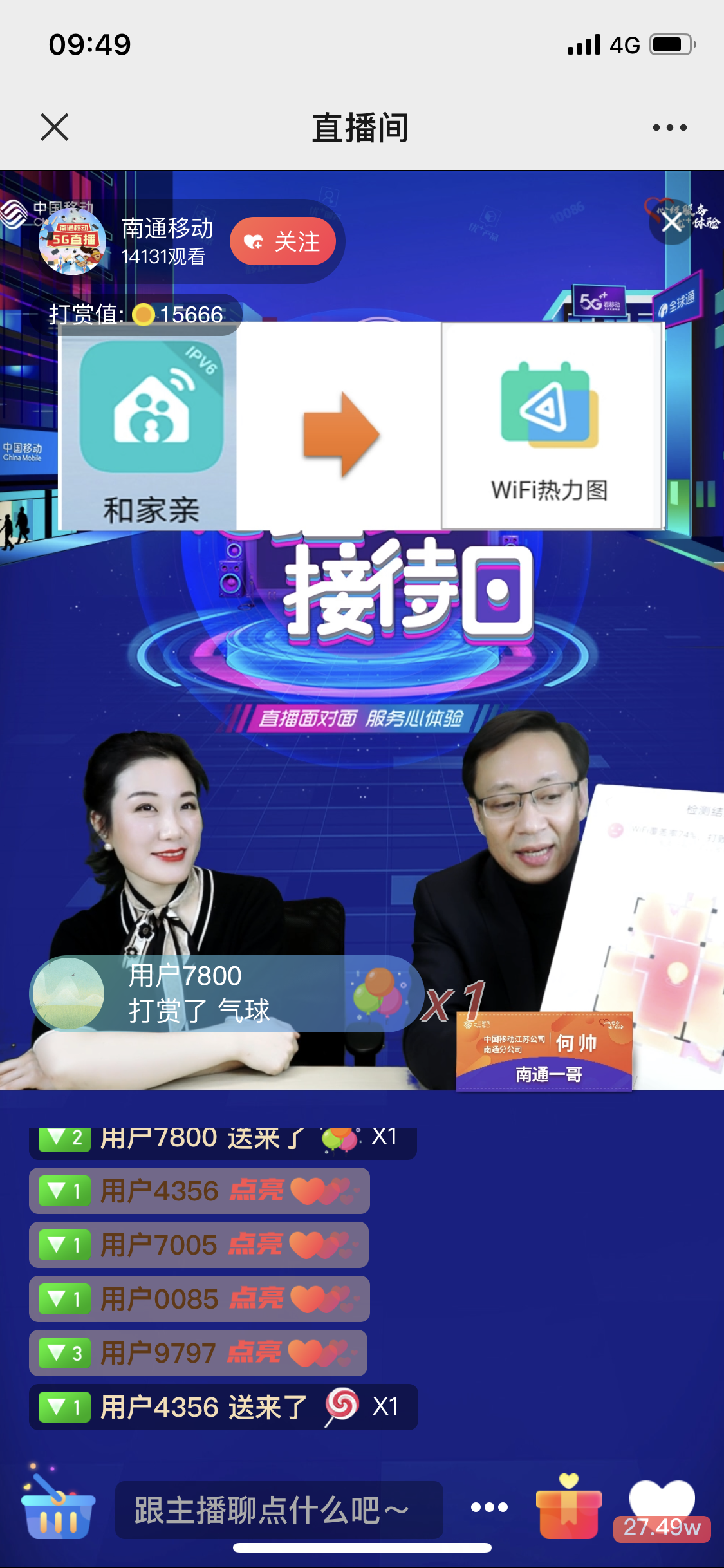 同时,南通移动人气“一哥”、优秀家庭产品装维工程师围绕客户关注的宽带网速、家庭智能产品、互联网电视接入等与直播间的观众进行了互动,为客户全面介绍了移动宽带、千兆路由器、家庭组网、移动看家等产品优势。