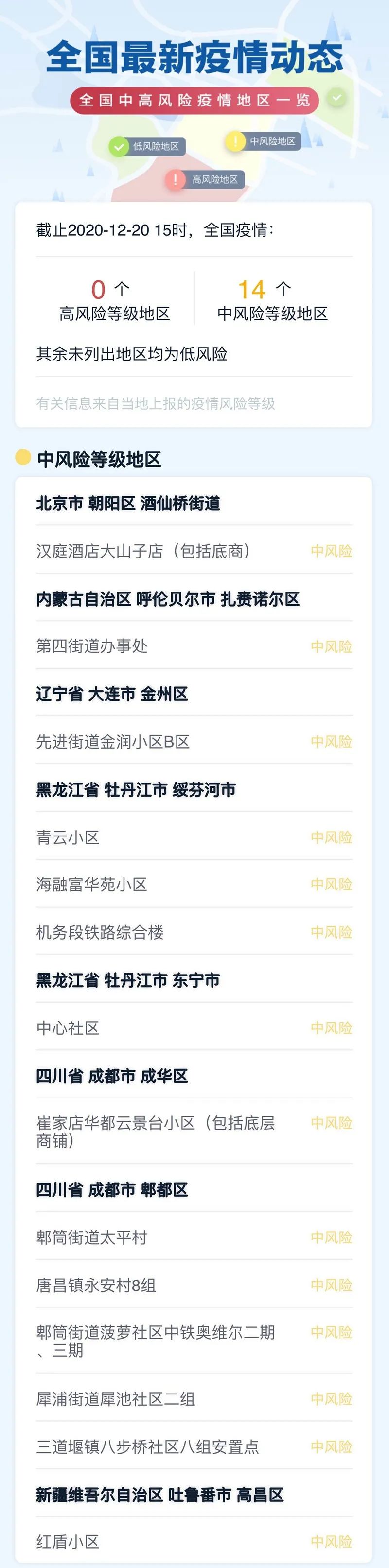截至2020年12月20日15时 全国无高风险地区 有14个中风险地区 (拉动右侧滚轴下滑查看)