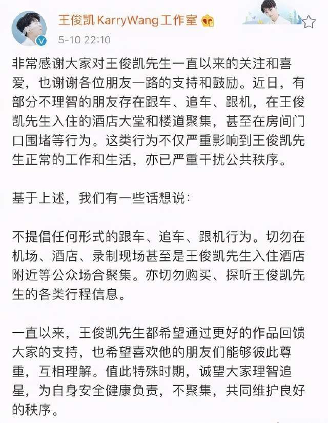 “粉丝”伴随着“偶像”诞生,因为这类群体的存在,渐渐“追星”发展成为一种可链条化的经济体系,“偶像”也不再是单纯因为优秀而被格外关注。 如果只是喜欢和崇拜,粉丝于偶像而言也是一种力量,至少可以让他们为了变得更好而努力... 但渐渐的,粉丝的性质也发生了改变,有些人“偷窥成癖”,甚至用违法手段来满足自己的私欲,于是诞生了这一批“私生fan”... 因为私生,很多明星真的正常生活和工作被干扰,甚至导致无休止的重复~ 今天,王俊凯工作室发表声明,警告大家理智追星。