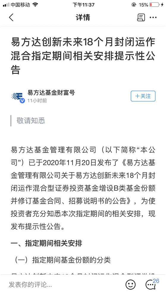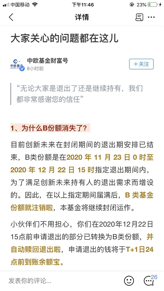 备受关注的5只蚂蚁战略配售的创新未来基金迎来新消息。 11月份,5只创新未来基金曾发布联合声明,将新设B类份额,供持有人申请退出所用,投资者可以按基金份额净值退出,时间是11月23日至12月22日15时。 为保障投资者权益,中欧基金、易方达基金等在12月20日在支付宝财富号上发布了相关提示性安排。当日下午15时,这5只基金的退出期已经截止,B份额自动注销,基金继续封闭运作。基金公司积极推进基金份额场内上市交易,持有人还可以选择基金转入场内卖出。 此次蚂蚁战略配售基金先后推出两种退出方案,给予投资者充分的选择权。这5只产品均采取头部基金经理管理,目前运作稳健,业绩最好者成立以来收益率超4%。 B份额注销 推进基金份额场内上市交易 牵涉600亿资金、1360万户持有人的蚂蚁战配基金,一举一动都备受关注。 12月22日中欧基金在支付宝中欧基金财富号上一则“重要通知”引起市场关注,其中将对创新未来投资者关心的6大问题给以充分解答。 基金君整体了中欧基金的6个问题回复,可以成为创新未来基金的投资者一个参考: 1、为什么B份额消失了? 目前创新未来在封闭期间的退出期安排已结束,B类份额是在2020年11月23日时至2020年12月22日15时指定退出期间内,为了满足创新未来持有人的退出需求而增设的。因此,在以上指定期间届满后,B类基金份额就注销啦,本基金将继续封闭运作。小伙伴们不用担心,你们在2020年12月22日15点前申请退出的部分已转为B类份额,并自动赎回退出啦,申请退出的钱将于T+1日24点前到账余额宝。 2、之后还能退出吗? 目前我们仍在积极推进基金份额场内上市交易,持有人可以将基金转入场内卖出(相关规则请以相关公告为准),届时蚂蚁将提供相应的平台功能方便大家使用。除此之外,大家也可以选择坚持持有,等到基金封闭期结束后就可以正常申购和赎回啦。 3、封闭期是什么时候开始计算的? 中欧创新未来的18个月封闭期是从基金成立日10月9号开始计算的。按照合同约定,18个月封闭期满后,本基金转为开放式基金,可灵活申赎。也就是说本基金剩余封闭期为15个月左右,将于2022年4月9日正式打开,接受申购和回。 4、我能加仓吗? 我们在全力推进开通场外基金份额转场内进行交易,如将来看好中欧创新未来想加仓,可以通过场内交易买入,或者等到2022年4月9日开放后申购。 5、这只基金会分红吗? 按照合同约定,本基金是可以进行分红的,具体分红计划以届时公告为准。 6、什么时候可以看到持仓和估值? 本基金目前还在建仓期,建仓期不超过6个月。本基金将于四季度结束后的15个工作日内披露四季报,也就是2021年1月20日左右,四季报中将披露基金的前十大重仓股等相关基金运作信息,详情以届时公告为准。 易方达基金在12月22日也发布了提示性公告,将此前的公告再重申了一次,也是提醒投资者注意退出期时限。 实际上,在12月18日,这五家基金公司也发布了提示性公告。提醒投资者注意退出时间,是2020年11月23日时至2020年12月22日15时内增设B类份额,供现有基金份额持有人申请退出所用。 此外,基金君发现,证监会官网显示,11月23日-24日,易方达基金、鹏华基金、汇添富基金、华夏基金和中欧基金旗下创新未来18个月封闭运作混合基金均申请了公开募集基金募集变更注册。最新进度跟踪显示,相关部门已于11月27日-12月1日决定受理。 明星基金经理“掌舵” 目前运作稳健 5只创新未来基金经理都是“头部基金经理”,如易方达陈皓、汇添富劳杰男、中欧周应波、鹏华王宗合、华夏周克平等,因此整体运作较为稳健。 从5只创新未来基金最新运作情况看,截至最新净值更新(12月22日),5只产品成立时间皆达到2个月及以上,仍处于初步建仓期,但基金净值表现相对稳健,5只产品平均收益率2.82%,收益率最高的产品净赚4.21%,悉数斩获正收益。 在投资层面,部分创新未来基金还在11月份发布公告,基金陆续参与了定增投资,部分产品还公告“可投科创板市场”,产品当前的投资管理处于正常状态。 就在12月,华夏基金还公告称,旗下部分基金公募基金参加了“一鸣食品”、“舒华体育”首次公开发行人民币普通股(A股)的网下申购。其中就出现了华夏创新未来18个月封闭运作混合基金的身影。 目前5只创新未来基金都属于中大型基金公司安排的明星基金经理管理,这些基金经理及其背后投研团队投资能力突出,长期业绩优异,投资水平经受住了市场的考验。建议投资者可以持续关注这些头部基金经理的表现,做好理性投资和长期投资。 ' g$ v8 D$ H& W3 e, P; q* z