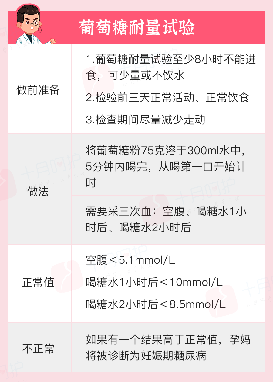 随着现在生活水平的提高,许多怀了孕的妈妈,为了给宝宝增加营养,都会选择食补的方式。 但是,不加节制地一味进补,有可能会引发妊娠糖尿病! 2014年新华网曾发表文章称:“我国每6名孕妇中,就有1人患妊娠糖尿病” 图片来源:新华网 越来越多的孕妈可能都会面临妊娠糖尿病的困扰,也因此会诞生更多的巨大儿,造成难产的几率也会增加! 这还真不是菌菌危言耸听,巨大儿的新闻几乎每隔一段时间就有,它并不罕见。 图片来源:人民网安徽视窗 图片来源:新浪河北 妊娠期糖尿病对孕妈和宝宝的危害都比较大。 因此,妊娠期糖尿病的筛查不容忽视! 什么叫糖筛? “糖筛”是妊娠期糖尿病筛查的简称,一般在孕24~28周及以后化验筛查。 孕妈如果有以下情况,就需要提前进行筛查: ● 糖尿病家族史; ●肥胖,怀孕前的体重指数(BMI)为30或以上; ● 患有与糖尿病发生相关的疾病,例如多囊卵巢综合征等; ● 上次怀孕的时候患有妊娠期糖尿病。 ps:体质指数(BMI)=体重(kg)÷身高2(m) 伤害极大的妊娠糖尿病 妊娠糖尿病如果控制不好,对于孕妈和宝宝的伤害都是非常的大。 ■ 对孕妈: 高血糖可使胚胎发育异常甚至死亡,流产发生率高达15%~30%。 发生妊娠期高血压疾病的可能性较非糖尿病孕妇高2~4倍。 未能很好控制血糖的孕妇易发生感染,可加重糖尿病代谢紊乱。 羊水过多发生率较非糖尿病孕妇多10倍。 ■ 对胎儿: 巨大胎儿发生率高达25%~42%。 胎儿生长受限发生率21%。 早产发生率为10%~25%。 胎儿窘迫和胎死宫中。 严重胎儿畸形发生率是正常妊娠的7~10倍 因此,孕妈千万别偷懒,糖筛是一定要去做的! 糖筛应该这么做 糖筛一般是直接进行75g葡萄糖2小时的葡萄糖耐量试验(OGTT),现在医院多用这种方法。 图片来源:十月呵护设计团队 不要为通过糖筛 采取任何手段 许多孕妈在做糖筛前会问菌菌,怎样才能顺利通过? 例如有位孕妈听说吃苦瓜可以降低血糖,所以做糖筛前一周狂吃苦瓜;还有些孕妈在做糖筛时不停地走来走去,想通过运动来降血糖。 图片来源:十月呵护漫画团队 菌菌提醒,不要为了通过糖筛采取任何手段! 因为检查的目的并不是为了顺利通关,而是需要知道孕妈身体是否有异常。 所以就算用一些手段过了检查,但其实是掩盖了你身体的真实情况,误导了医生,也耽搁了病情。 大多数患有妊娠期糖尿病的孕妈,只要在合理搭配饮食,并进行适量运动,就能很好的控制血糖。 当饮食和运动都无法控制在合理范围内的时候,就需要药物来进行治疗。 目前我们用于控制血糖的药物多数会使用胰岛素,这种药物对胎儿没有太大的影响,孕妈不用担心。 另外,由于“糖妈”产后患Ⅱ型糖尿病的概率比别人高,所以产后也需要注意血糖。 - g# I3 j; ]( k8 `! V