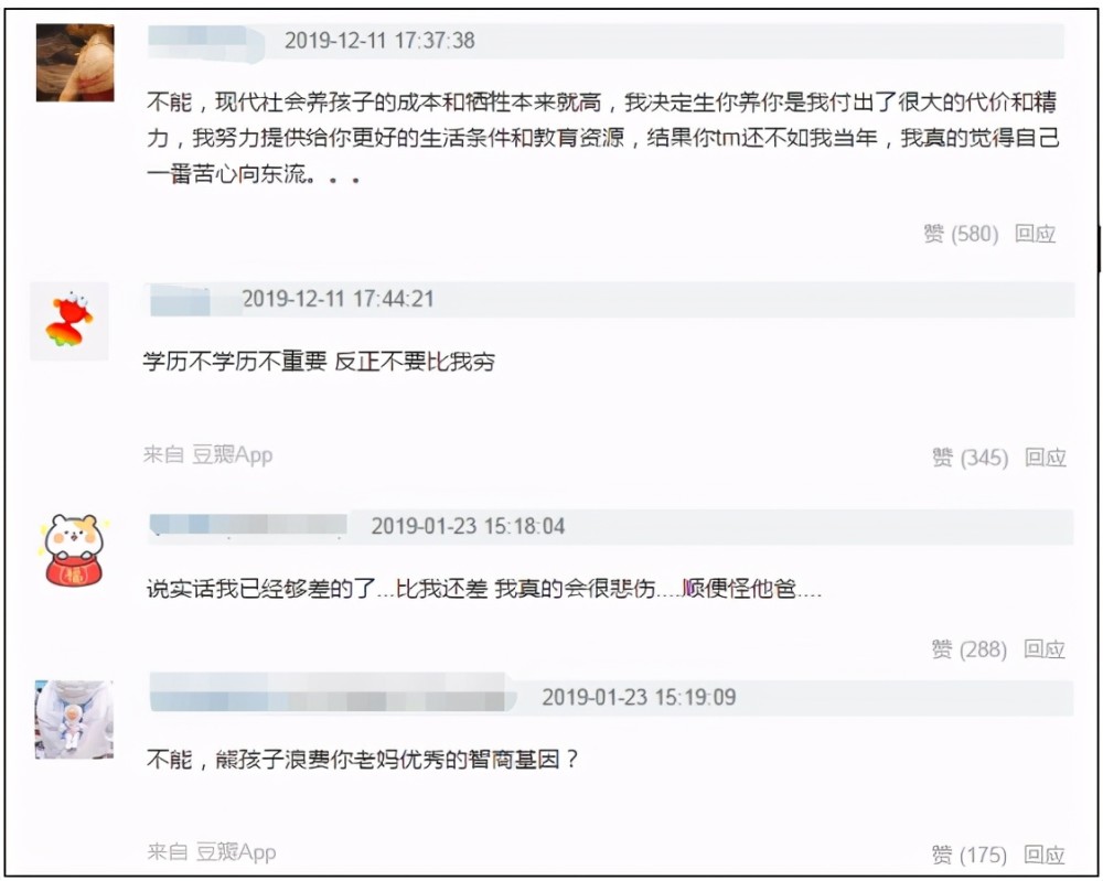 豆瓣和知乎上,时不时就有人问“你们能接受孩子学习成绩比自己当年差吗”“你们能接受孩子学历比自己低吗?”“大家能接受孩子混得比自己差吗?”