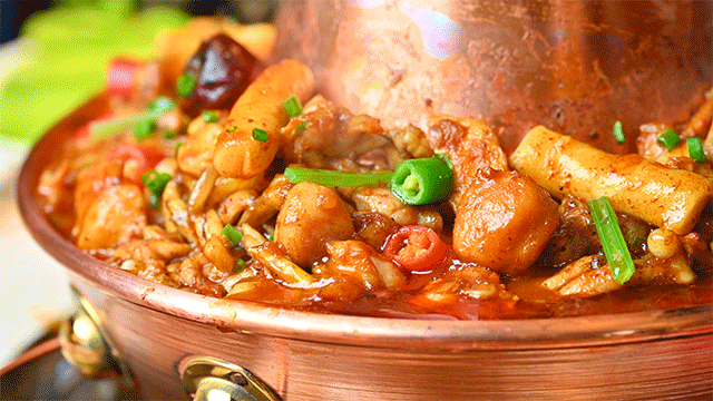 半米高的双层铜锅一上来就获得了小伙伴们的阵阵欢呼,360度满满全是蛙肉!蘸满了酱汁的蛙腿,因为太满而摇摇欲坠!蛙肉过油,再加入辣三多秘制的酱料,大火爆炒出味儿,上火后再炭火慢煮。酱汁吸得饱满,蛙肉外头薄酥,里头却一咬即化,每一口都超鲜嫩!