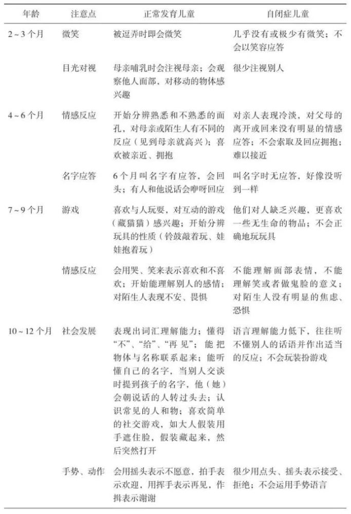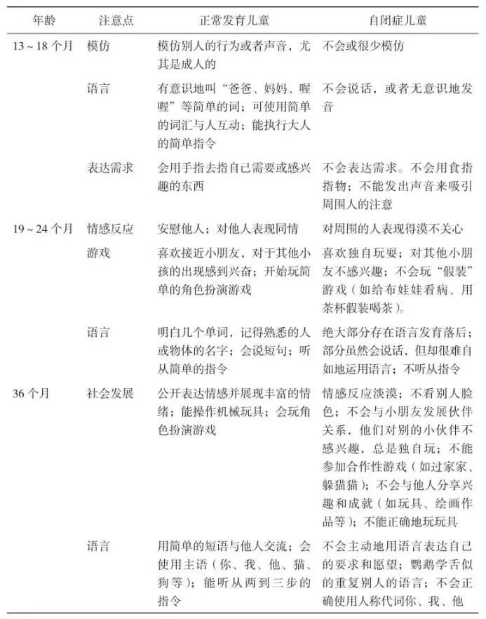 崔玉涛的育学园 听过不少人有这样的疑惑: “我家孩子比较内向,在集体里总是形单影只,不愿意和小朋友亲近,说话也晚,看起来发育似乎也比较其他孩子慢。 所以,我的孩子是自闭症吗?” 自闭症孩子的很多生理功能是正常的,但是却好像和这个世界失了联,他们像天上的星星一样,看起来近在咫尺,心却和家人与外界离得很远很远。 自闭症的孩子有哪些表现? 简单来说,自闭症孩子的表现一般有五个“不”: 不看,孩子不爱看人,和其他人很少或没有视线交流; 不语,和其他人很少或没有语言交流; 不指,和其他人很少或没有动作交流、互动; 不应,面对互动等没有回应; 不当,一些行为举止特别刻板或者兴趣爱好特别狭窄等。 具体一点,自闭症孩子的表现又非常综合,不是依靠单一的症状就可以定论的: 孩子的情绪特别容易失控,明明去的是很高兴的场合,做的是应该很开心的事,却大发脾气、又哭又闹,问为什么,也不愿意说…… 孩子很少跟其他小朋友互动,也不喜欢去人多的地方,可以自己静静地玩很久,总是显得不合群…… 每次叫孩子的名字,他好像都听不见一样,明明很大声吼了,可还是没有任何回应…… 也可能总是表现得很兴奋,不管在哪儿,一天都晚都要到处跑来跑去,追都追不上…… 自闭症儿童与普通发育儿童,在早期社交语言发展中的区别如下: 作为家长,自闭症是否可以尽早自查? 美国佛罗里达州立大学研究者通过观察发现,以下特征可以作为自闭症早期预警信号: 如果孩子出现以上任何一项表现,家长应该尽快送孩子往专业机构进行自闭症筛查评估。 另外,也可以使用以下简易婴幼儿自闭症筛查量表,进行快速筛查。 家长自行筛查后,最终真正的儿童自闭症诊断,只有在医院中具有相关专业资质的医生才可以进行。 在《ADOS自闭症行为观察诊断量表》中,最小的诊断月龄为12月龄。 但要对一两岁甚至更小的孩子观察有无自闭行为的异常,并不是一件十分容易的事。 所以,定期带孩子接受保健科的全面体检是十分重要的。 孩子确诊了不是自闭症,但是孩子在一些行为上的表现的确与自闭症相似,说明孩子在这些方面还是薄弱的,需要及时干预和引导,使其尽快回到正常的水平。 对于已经确诊为自闭症的孩子,要正确看待孩子在当前发育水平中的不足,及早进行必要的干预和引导,而绝对不是逃避。 家长应接受医生和治疗师给出的治疗方案,根据孩子的年龄、分级和薄弱环节,有针对性的进行干预和治疗,以便能够最大程度地改善孩子的情况,能够更好的回归社会、融入社会。 4 i! \* h3 E& N# a+ `
