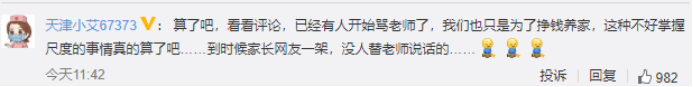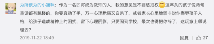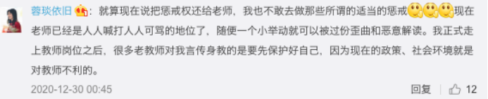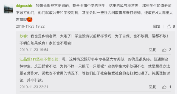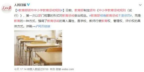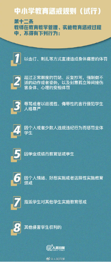 上周教育部制定颁布了《中小学教育惩戒规则(试行)》。 从2021年3月1日起,也就是寒假过后的这个学期,《规则》就要正式实施了。 非常有意思的是,我刚刷到这条新闻的时候,几乎同时收到了两条微信。 一条来自于我的中学同学,一条来自于大学校友。 一位是刚上一年级小学生的妈妈,一位是北京某小学的老师。 她俩的问题倒是很默契,都是:“你对这个《教育惩戒规则》,怎么看?” 其实这个《中小学教育惩戒规则》会引起大家的讨论并不奇怪。 早在2019年底,《中小学教育惩戒规则》发布征求意见稿的时候,一下子就引爆了热议。 当时,新浪微博@央视新闻发起了一个投票,有近8万人参与: 我也写了一篇《教育部公布《教育惩戒规则》| “连国家都鼓励体罚孩子了?”》,记录了网友们的一些典型观点。 87%的网友都支持老师拥有惩戒权,大部分人都觉得:好的教育不可能只有表扬和鼓励,也需要有必要的惩罚。“跪着的老师教不出站着的学生”,如果老师遇到问题不敢管、不愿管,那最吃亏的还是咱们的下一代。 当然,反对或犹豫的声音也不少。 作为一个妈妈,我能理解这样的质疑,很多家长即使理性上知道老师拥有惩戒权的必要性,但感性上还是有一些担忧,所以希望能在“把握好度”的前提下再去谈惩戒。 那么问题来了,到底《教育惩戒规则》的颁布是好事还是坏事? 这就是两个朋友同时给我发信息,我觉得有意思的地方。 她俩给我发的信息内容,刚好一个是家长一个是老师的忧虑。 是的!老师也有忧虑。 对于老师来说,教育部明文规定赋予了惩戒权,这是教育工作者地位提高的表现,是国家重视教育的积极信号。 “戒尺”交回了老师手中。我这位朋友却说,她完全高兴不起来。 不仅是她,我有很多本科同学都在教育行业工作,其中的中小学老师也不少,大部分都表示“不想 给自己找事”。 网上也有一些老师议论:高兴不起来、不敢去惩戒、只求平安退休…… 为什么会这样呢?可以看看《中小学教育惩戒规则》对“教育惩戒”的定义: 教育惩戒是“学校、教师基于教育目的,对违规违纪学生进行管理、训导或者以规定方式予以矫治,促使学生引以为戒、认识和改正错误的教育行为”。 《规则》强调,实施教育惩戒应当遵循教育性、合法性、适当性的原则,“符合教育规律,注重育人效果;遵循法治原则,做到客观公正;选择适当措施,与学生过错程度相适应”。 那么,“符合教育规律”——让老师们参考的教育规律是什么?快乐教育还是唯成绩论?以谁制定的标准为准? “做到客观公正”——不同的老师有不同的主观意识,就算老师努力做到客观公正,关键是被罚孩子的家长认不认同呢? “选择适当措施”就更难操作了,每个孩子的性格、成长环境、家庭教育都不一样,心理承受能力也不是固定的,一样的惩罚,皮实的孩子可能根本不当回事,脆弱的孩子可能就走极端了。 举个例子,比如说下面这个《禁止行为》里面的: “反复抄写”——我见过让孩子抄3遍的,也见过抄50遍的,多少算正常,多少算超出限额呢? “因学业成绩而教育惩戒”——如果孩子考试时一个问题总是做错,老师要求他多抄几遍巩固记忆,这算不算违规呢? …… 既然多做多错,不做不错,老师们难免要有“多一事不如少一事”的态度了。 惩戒权尺度不明,除了让老师为难,也让家长们心里不安。 这就是我另一位朋友的担心。 每当看到新闻里的虐童事件,哪个做家长的不是心惊胆战?虽然没有师德的老师是极少数,但怕就怕自己孩子碰上的是那个“万一”啊。 虽然《规则》规定了种种限制,但如果就是有个别不好的老师借题发挥,对孩子进行超过限度的惩戒呢? 本来老师还会想办法正面引导孩子的,现在有了《规则》,会不会就没什么耐心讲道理,直接简单粗暴地惩戒了? 其实不管是老师,还是家长,对这个问题的焦点都在于—尺度。 戒尺是死的,用戒尺的却是人。 其实,在2019年的那篇文章里,我就跟大家聊过我的观点。 教育部颁布这个《中小学教育惩戒规则》,绝不是鼓励老师以暴力和不理性的方式惩教学生,我本人自然也是坚决反对老师以“教育”为名,体罚、甚至虐待孩子的。 不过,有句俗话说:没有规矩,不成方圆。现在的孩子越来越金贵,学校和老师在给孩子“立规矩”的时候,也变得越来越束手束脚,原本家长把孩子送到学校是为了让他们能够“成方圆”,可是在那么多家长的警惕眼神之下,慢慢就形成了老师“不敢管,不愿管”的尴尬局面。 有两个新闻跟大家分享一下。 2019年,山东五莲二中杨守梅老师,因为两个学生违纪,一时生气,将手中的课本扔向了他们,结果家长闹到学校说老师体罚了孩子,要求道歉赔偿。学校和教体局为了息事宁人,接连给予了杨老师如下处分:当众道歉、停课、赔偿、党内警告、行政记过、扣发全年绩效、解聘、纳入社会信用黑名单…… 这样的顶格严厉处罚,引起了轩然大波,央视《新闻周刊》也关注了此事,最终当地教体局撤销了对老师的不公平处罚,杨老师也调往另一所学校任教。 2020年5月,微博上一则“老师体罚哮喘学生至吐血抢救”的消息登上了热搜,被阅读5.4亿次。而这位广州某小学的“无良老师”也被指名道姓地骂上了热搜,被人肉骚扰,被千夫所指。 但反转很快来了:孩子在学校被老师罚跑是真,但孩子并没有哮喘,也没有吐血,图片里触目惊心的血衣是这个