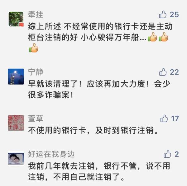 你有没有长期没使用 但仍没注销的银行卡? 注意了! 近期 建设银行、中信银行、邮储银行等 多家银行纷纷发布公告 将对异常账户进行清理 一些长期没有交易 并且没有资金的“睡眠账户” 以及同一客户名下的超量账户 都将被银行注销 多家银行出手注销“睡眠账户” 建设银行官网1月5日发布的《关于清理长期不动个人银行账户的公告》显示,截至2020年10月31日,连续三年以上(含三年)未发生存现、取现、转账等主动交易,账户余额为0,且无信用卡约定还款、个人贷款还款等签约关系的借记卡、准贷记卡、活期存折账户,均在清理范围内。 同时,公告表示,如果希望继续使用的,持卡人可以于2021年1月20日之前持银行卡或存折、有效身份证件到该行任一网点办理激活手续;如未对符合上述销户条件的账户进行激活,银行将依据公告内容对符合条件的长期不动个人银行账户予以销户。 记者注意到,近期发布类似公告的银行不止一家。 中信银行近期也发布公告称,该行将于2021年1月8日起,对账户余额低于10元人民币(含)以下,以及截止每年10月底,账户连续两年(含)以上未发生任何非结息交易的个人结算账户展开清理工作。同一客户在中信银行持有一百个及以上正常或未激活的个人结算账户也将被限制交易。后续,该行将于每年第四季度(含2021年)对满足以上标准的账户进行清理,限制账户交易功能。 邮政储蓄银行也在去年12月29日发布《关于开展个人存量异常账户清理工作的公告》,将于2021年6月30日(含)前逐步分批对同一客户名下个人结算账户超标准(即Ⅰ类户1个、Ⅱ类户5个、Ⅲ类户5个)数量进行清理。如账户存在上述情况,本人持有效实名证件,尽快到该行任意网点进行合理性登记、降级以及销户处理。逾期未清理的账户,该行将限制金融服务。 剑指防范电信诈骗风险 当前,为了严厉打击整治非法贩卖手机卡、银行卡违法犯罪,2020年10月,一场全国性的“断卡行动”拉开序幕,对非法开办贩卖电话卡、银行卡违法犯罪进行严厉打击整治,坚决斩断电话卡、银行卡的买卖链条。断卡行动中,银行也全面加速清理异常银行账户。 有银行人士表示,银行卡贩卖是电信网络诈骗高发的主要原因之一,作为银行账户的第一道防线,各大银行目前也在落实人民银行打击电信网络诈骗的相关要求。 记者注意到,公告中,邮储银行、中信银行都明确表示,清理行动是为了加强账户管理,防范电信诈骗风险。 实际上,银行开展清理“睡眠账户”的行动已实施多年。根据央行规定,自2016年12月1日起,同一个客户在同一银行只能开立一个I类账户的银行卡,如果已经有Ⅰ类户的银行卡,那么再开户时,只能开立Ⅱ、Ⅲ类账户的银行卡。随后,清理个人长期不动户成了多家银行的工作重点。农业银行、中国银行、招商银行、华夏银行等银行也都曾发布过类似通知,对同一存款人开户数量较多的情况进行清理。此外,除了加大对个人银行账户的清理力度外,银行也在加大对对公账户的整改。 央行发布的《中国普惠金融指标分析报告(2019年)》显示,截至2019年末,全国人均拥有8.06个银行账户,同比增长11.63%;人均持有6.01张银行卡,同比增长10.48%。 虽然人均账户数量增多,但是其中有部分成为了睡眠账户,难以被有效利用,甚至让不法分子有机可乘,试图通过银行账户进行非法交易,获取不当利益。 银行人士建议,持卡人一定要管理保护好自己的银行卡,可以自行对自己的账户进行清理,对于确实已经不再使用的银行卡,可主动注销,以免不用的银行卡被不法分子利用,带来不必要的风险。目前大部分银行都已支持异地网点注销银行卡。 ” 需要特别强调的是 千万不要出租、出售、出借 银行卡或支付账户 而对于不希望被冻结的银行卡,只要每年通过ATM、网上银行或手机银行等任意渠道办理一笔业务或者进行转账等交易,就不会被银行认定为是“睡眠账户”。 链接:银行三类账户有何不同? 自2016年12月1日起,银行账户被分为Ⅰ类、Ⅱ类、Ⅲ类,类别不同,功能不同。 Ⅰ类户是全功能的银行结算账户,必须在柜面或通过银行自助机具,经银行工作人员现场面对面审核身份后开立,存款人可通过Ⅰ类户办理存款、购买理财产品等金融产品、支取现金、转账、消费及缴费支付等全部金融业务,没有限额。 Ⅱ类户可以办理存款、购买投资理财产品等金融产品、限额消费和缴费、限额向非绑定账户转出资金业务。经银行工作人员现场面对面确认身份的,Ⅱ类户还可以办理存取现金、非绑定账户资金转入业务,可以配发银行卡实体卡片。其中,Ⅱ类户非绑定账户转入资金、存入现金日累计限额合计为1万元,年累计限额合计为20万元;消费和缴费、向非绑定账户转出资金、取出现金日累计限额合计为1万元,年累计限额合计为20万元。 Ⅲ类户权限最小,只能办理限额消费和缴费、限额向非绑定账户转出资金业务。经银行柜面、自助设备加以银行工作人员现场面对面确认身份的,Ⅲ类户还可以办理非绑定账户资金转入业务。其中,Ⅲ类户账户余额不得超过1000元;非绑定账户资金转入日累计限额为5000元,年累计限额为10万元;消费和缴费支付、向非绑定账户转出资金日累计限额合计为5000元,年累计限额合计为10万元。 网友评论 ( f% _ k/ E5 D0 ?9 G, a% z