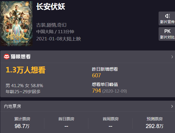 最近票房市场十分火热,《送你一朵小红花》、《温暖的抱抱》、《拆弹专家2》经过了元旦档的大爆特爆之后,票房后劲依旧给力,三部影片合计共砍下近25亿的票房,可喜可贺。 而接下来,票房市场又将迎来多部新片,其中由多位周星驰黄金配角参演的特效大片《长安伏妖》,受到了诸多关注。 《长安伏妖》是由李力持、王凯联合执导,保剑锋、克拉拉、吴孟达、贾冰、迟帅、孙耀威、徐冬冬、罗家英、张磊、安琥、钟夫翔、李子雄等主演的大型古装玄幻电影。 影片讲述了江湖神秘组织天蚕派兴妖作乱,欲犯长安,护卫长安城安宁的长安七骑奉命出动捉妖,不幸惨遭意外,李长安为弥补过失挺身而出,担起降妖伏魔的重任并最终战胜自我,拯救长安城的故事,于2021年1月8日在中国大陆上映。 该片请来了12位大众非常熟悉的明星,保剑锋担任男主角,周星驰电影黄金配角吴孟达、罗家英等强势加盟。 导演方面《长安伏妖》由李力持和王凯联合执导。 李力持应该是很多观众都非常熟悉的导演了,他跟周星驰合作的《唐伯虎点秋香》、《食神》、《破坏之王》、《国产凌凌漆》、《喜剧之王》等都早已成为华语喜剧经典,李力持因此也被很多人称为星爷的“御用导演”。 此外影片还请来了韩国知名女星克拉拉,犹记得她在《情圣》里面美得简直令人窒息,确实令人颇为期待。 不过虽然影片明星众多,但影片票房方面还是十分悲剧,首日票房仅有98万,12位明星都未能撑起票房! 此外《长安伏妖》口碑方面也一言难尽,剧情浮夸,特效五毛不说,海报还被很多人吐槽抄袭《妖猫传》,相当尴尬。 说起来,这些黄金配角当年在周星驰电影里的表现可谓无比出彩。 罗家英饰演的“唐僧”至今仍被人津津乐道,而吴孟达就更别说了,跟星爷合作的《赌圣》、《鹿鼎记》、《审死官》、《武状元苏乞儿》、《九品芝麻官》、《逃学威龙》、《大话西游》、《少林足球》、《喜剧之王》、《食神》等几乎每一部都是经典中的经典,一直都是大众眼里的黄金搭档。 离开周星驰后,罗家英、吴孟达甚至李力持等作品依旧层出不穷,但口碑方面却彻底扑街,烂片一部又一部,票房方面同样不忍直视,十分悲剧。 如今这部《长安伏妖》阵容强大,12位明星强势加盟,其中更有吴孟达、罗家英等周星驰黄金配角,按理说票房破亿应该很轻松才对。 但没想到《长安伏妖》票房口碑又再度扑街,离开周星驰后,他们再也撑不起票房了!