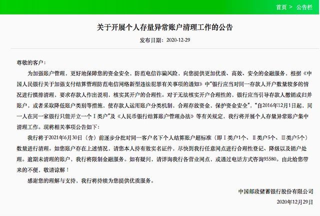 近期,建设银行、中信银行、邮储银行等多家银行纷纷发布公告,将对异常账户进行清理,一些长期没有交易且没有资金的“睡眠账户”,以及同一客户名下的超量账户,都将被银行注销。 为什么要清理“睡眠账户” 怎么看自己有没有“睡眠账户” 如果自己的账户被 别人冒用了又该怎么办? 多家银行开始清理“睡眠账户” 近日,包括中信银行、建设银行、邮政储蓄银行在内的到家银行发布公告,开始清理“睡眠账户”。 中信银行明确,自2021年1月8日开始, 对账户余额低于10元人民币(含)以下以及截至每年10月底,账户连续两年(含)以上未发生任何非结息交易的个人结算账户,将被限制交易。 同一客户在该行持有一百个及以上正常或未激活的个人结算账户,也将被限制交易。 建设银行称,将在2021年1月21日至2021年2月28日,对长期不使用的个人银行账户进行销户清理,范围包括: 截至2020年10月31日,连续三年以上(含三年)未发生存现、取现、转账等主动交易,账户余额为0,且无信用卡约定还款、个人贷款还款等签约关系的借记卡、准贷记卡、活期存折账户。 金融社保卡、公积金卡、军人保障卡等个人银行账户不纳入本次销户清理范围。 邮政储蓄银行公告显示,将于2021年6月30日(含)前逐步分批对同一客户名下个人结算账户超标准(即Ⅰ类户1个、Ⅱ类户5个、Ⅲ类户5个)数量进行清理。如账户存在上述情况,本人持有效实名证件,尽快到该行任意网点进行合理性登记、降级以及销户处理。逾期未清理的账户,该行将限制金融服务。 “睡眠账户”成为电信欺诈重要工具 对于清理个人长期不动户及个人开立多个结算账户的原因,中信银行、邮储银行都在公告中明确表示,清理行动是为了加强账户管理,防范电信诈骗风险。 根据央行发布的《中国普惠金融指标分析报告(2019年)》,截至2019年末,全国人均拥有8.06个银行账户,同比增长11.63%;人均持有6.01张银行卡,同比增长10.48%。 虽然人均账户数量增多,但是其中有部分成为了“睡眠账户”,无形中成为不法分子实施电信欺诈的重要工具,对社会和个人带来极大危害。 此次多个银行开始清理包括“睡眠账户”和超量账户在内的异常账户,对个人用户来说有助于防范个人风险,避免自身账户被不法分子利用,也为银行账户安全筑起一道防线。 如何保护我们的银行账户安全 除了银行对“睡眠账户”进行清理以外,个人用户也应提高防范意识,积极清理“睡眠账户”。 一是增加账户盘点意识,定期梳理个人名下账户及资产状况,养成查账记账的良好习惯。 二是加强风险管理意识,在密码设置、账户登录管理等方面加大保护措施,对冗余账户及时注销,以避免被不法利用的风险。需要特别强调的是,千万不要出租、出售、出借自己的银行卡或支付账户。目前大部分银行都已支持异地网点注销银行卡。 三是对于不希望被冻结的银行卡,只要每年通过ATM、网上银行或手机银行等任意渠道办理一笔业务或者进行转账等交易,就不会被银行认定为是“睡眠账户”。 四是如果发现自己的账户被冒用,及时和银行反馈并报警,避免更大损失。 “睡眠账户”极易被不法分子盯上 不因给个人带来资金和财产损失 甚至会导致个人信息泄露 甚至影响个人征信 造成极大的危害 看完这篇文章 赶紧去查查你的银行账户吧!