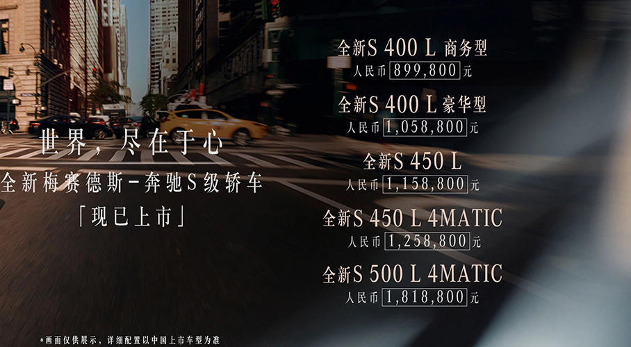 1月29日,新一代奔驰S级(底盘代号W223)在国内正式上市销售。新车共推出了5款车型,官方指导售价为89.98-181.88万元。新车作为家族中的第11代车型,不仅采用了最新家族式的设计,以及焕然一新的交互式内饰布局,同时科技和安全配置更是大幅提升。而先期上市的新一代S级全系搭载还了3.0T直列六缸双涡轮增压发动机,并配有EQ Boost 48V轻混系统。 作为换代车型,全新一代奔驰S级采用了新家族式的设计语言,这种设计最早在CLS上使用。其中前脸中心为多边形盾形格栅,格栅内部为三横幅式镀铬设计,两侧前大灯组造型更为犀利且加入了鹰勾式LED灯带,配合车头矗立着的“三叉星徽”。与上一代车型相比,新一代奔驰S级在视觉上显得更加精致。另外,奔驰还为新车提供了两种不同样式的保险杠供选择,分别对应“豪华”和“运动”的风格。 新一代奔驰S级延续了流畅和旗舰级的霸气身段,并首次配备了隐藏式门把手,不仅充满了满满的仪式感,也对降低行驶风噪有着一定的帮助。车身长宽高分别为5320mm/1954mm/1530mm,轴距则为3216mm。而车尾则采用了家族式三角型尾灯组,中央处还由镀铬饰条进行连接,形成贯穿式的视觉效果,车尾底部还使用了双边共两出排气的设计,整体看起来更加的低调和沉稳。 内饰方面,新一代奔驰S级的内饰设计和布局都进行了焕然一新的升级。其中大面积垂瀑式开孔木饰板前后辉映,其灵感源自豪华游艇的游艇甲板,营造出犹如贵宾厅般的豪华空间。内部配有全新造型的三辐式多功能方向盘、全新12.3英寸全液晶仪表(支持裸眼3D和多种主题模式切换)、12.8英寸的OLED中控多媒体触摸屏,内部集成全新MBUX信息娱乐系统,并具有OTA升级及智能互联功能,以及巨大的AR-HUD抬头显示系统。 科技方面,更加数字化的车机交互可以说是新一代奔驰S级的重大亮点之一。新车将支持超过50项电子组件进行OTA软件更新,包括最新的MBUX车机系统、数字仪表盘、驾驶辅助系统以及智能数字大灯等照明系统。新车中控台驾驶员一侧的上半部分集成了增强现实型抬头显示(AR-HUD),为驾驶辅助系统和导航信息提供了大量增强现实的内容展示,可根据现实道路的构成在HUD中提供相应的功能指示。新车还将采用全液晶仪表盘,该仪表盘可以展示不同风格的界面UI为用户带来不一样的视觉体验。 动力方面,此次进口国内市场的新一代奔驰S级提供了S 400 L、S 450 L和S 500 L这3款车型,全系均搭载了代号M256的3.0T直列六缸发动机,并分为低/中/高功率三种调校,同时搭配了48V微混系统。其中S 400 L最大功率为313Ps,峰值扭矩450Nm;S 450 L最大功率367Ps,峰值扭矩500Nm;而S 500 L最大功率435Ps,峰值扭矩520Nm。传动方面,两款车型均匹配9速手自一体变速箱,顶配与次顶配车型还搭载了4MATIC全时四驱系统。 ! K' Q# u& O+ A/ A& A0 J; W